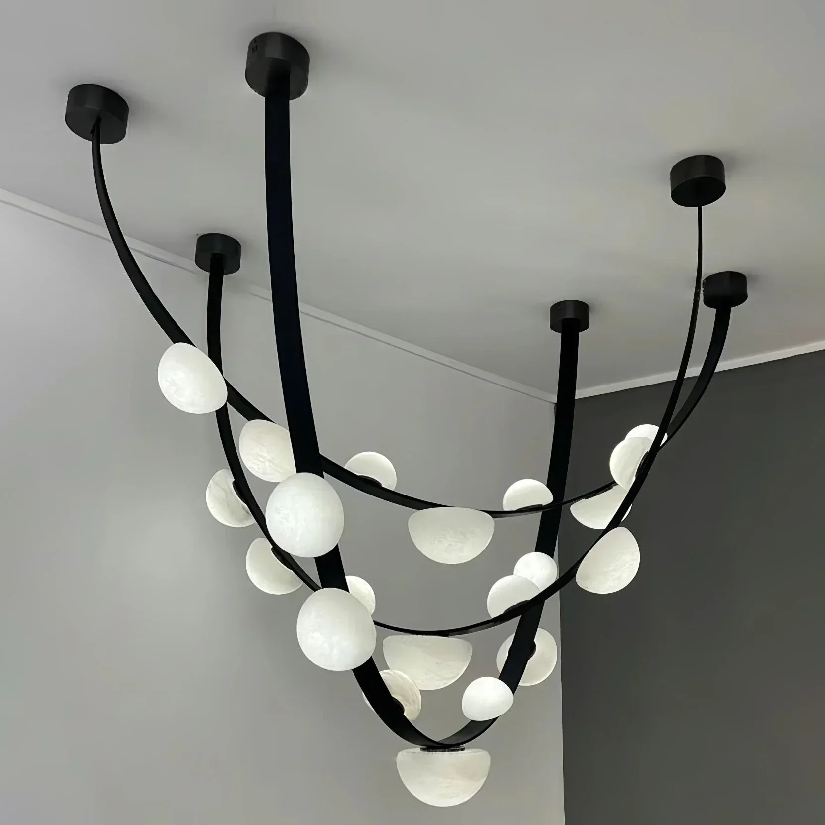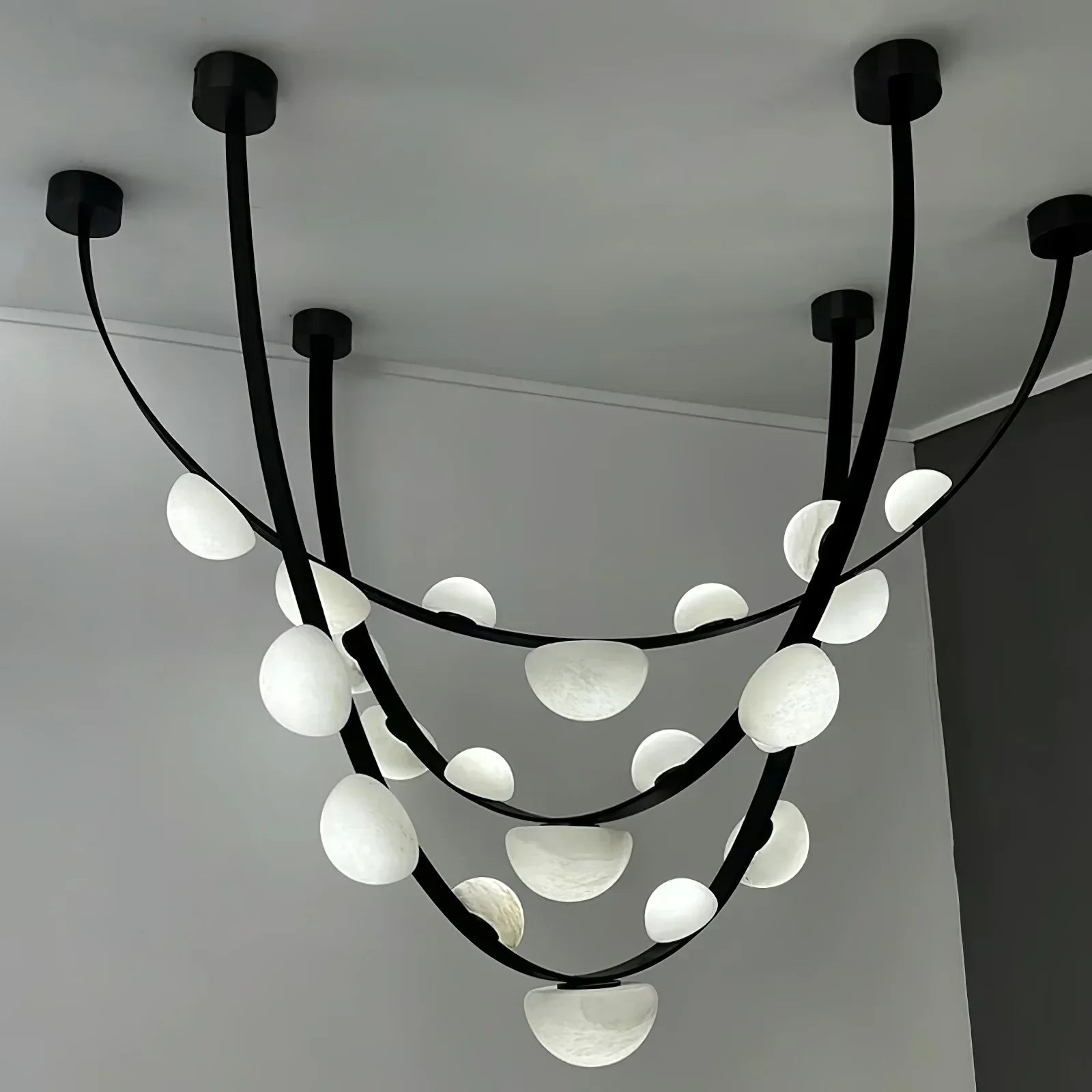 Capture the natural beauty of dew drops with our Dew Drops Alabaster Chandelier. Its intricate details were inspired by the familiar yet captivating shape of dew drops on blades of grass, adding a touch of fascination to any space. Each piece is a stunning work of nature's art.