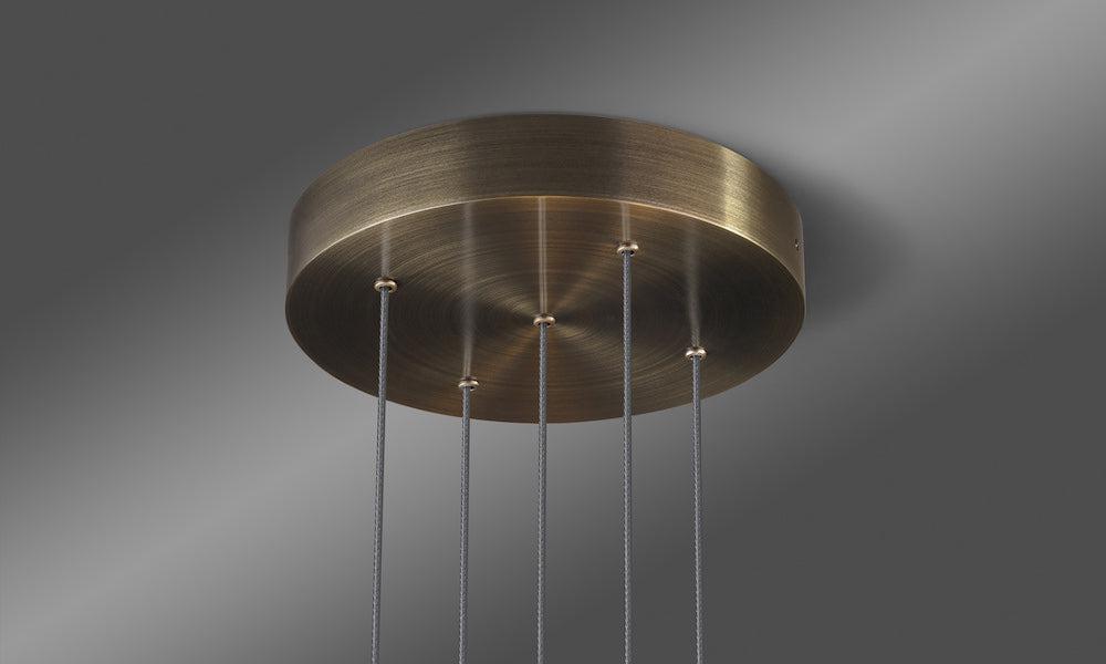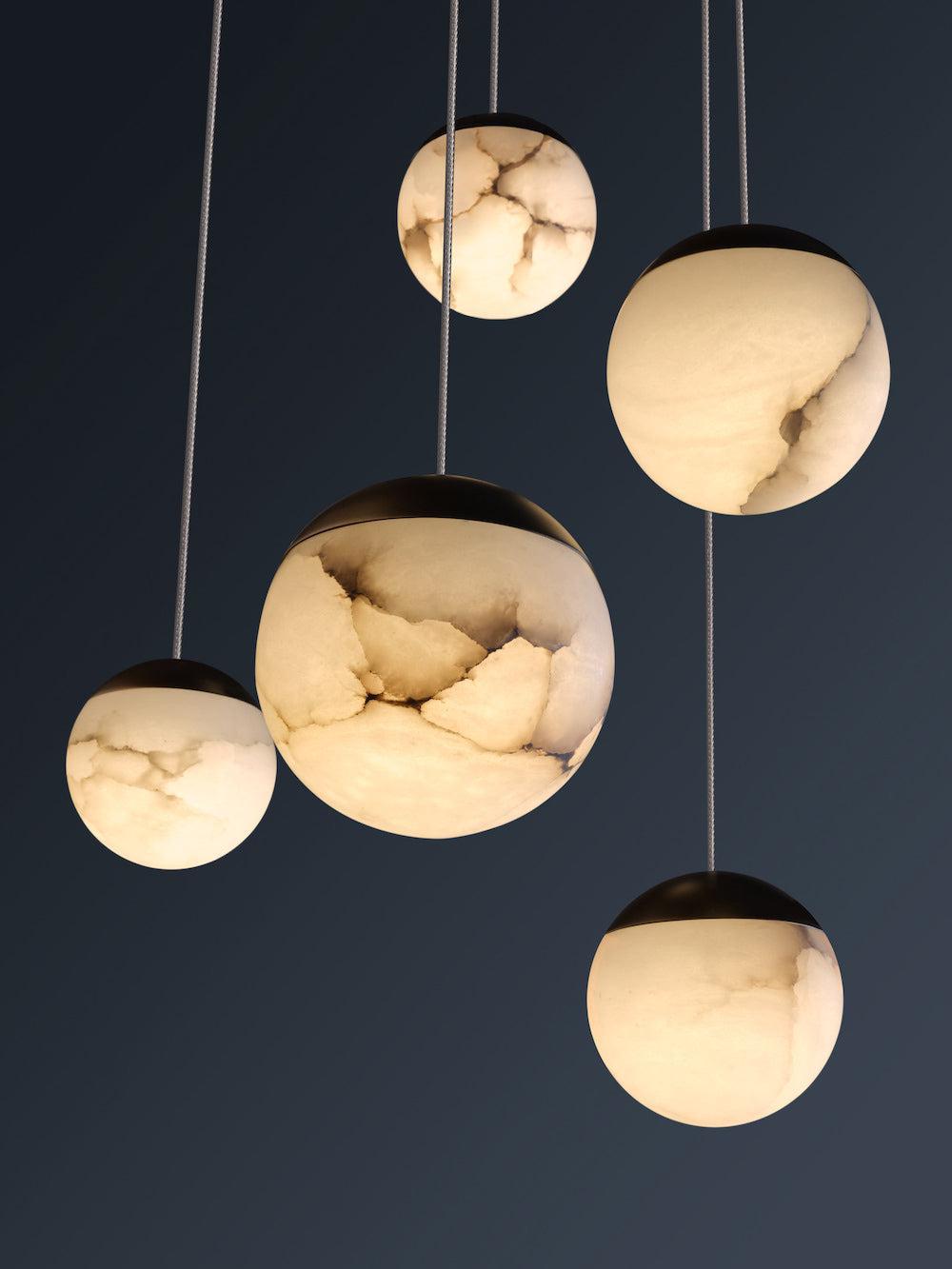 The Callisto fixture features brass and alabaster orbs that cascade through your interiors. Each alabaster sphere is hand turned and features a unique pattern and natural beauty.