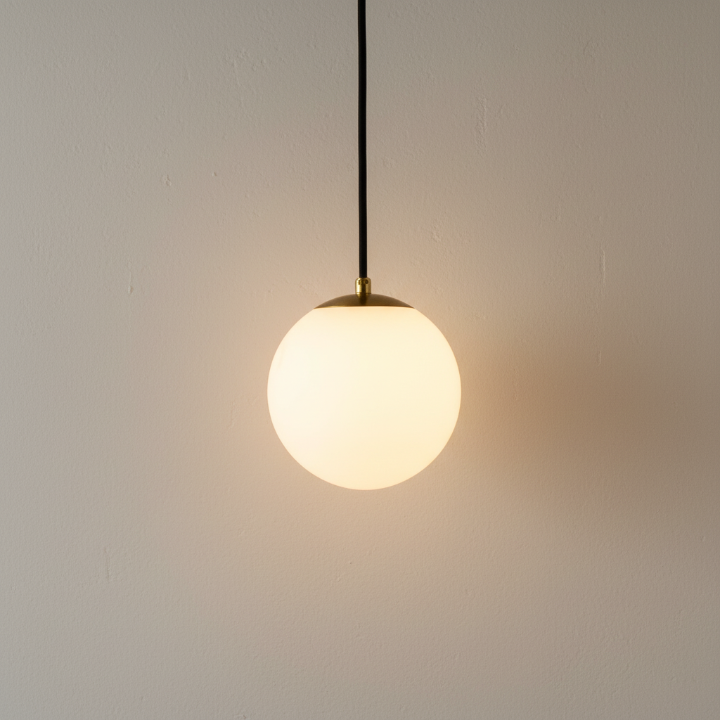 The product brings warmth and geometry into perfect balance. A single alabaster globe glows like a softened moon, its surface marked with natural stone veining that makes every piece unique. Suspended from a slim brass stem, it floats with quiet confidence, adding a touch of soft, modern elegance to any room.