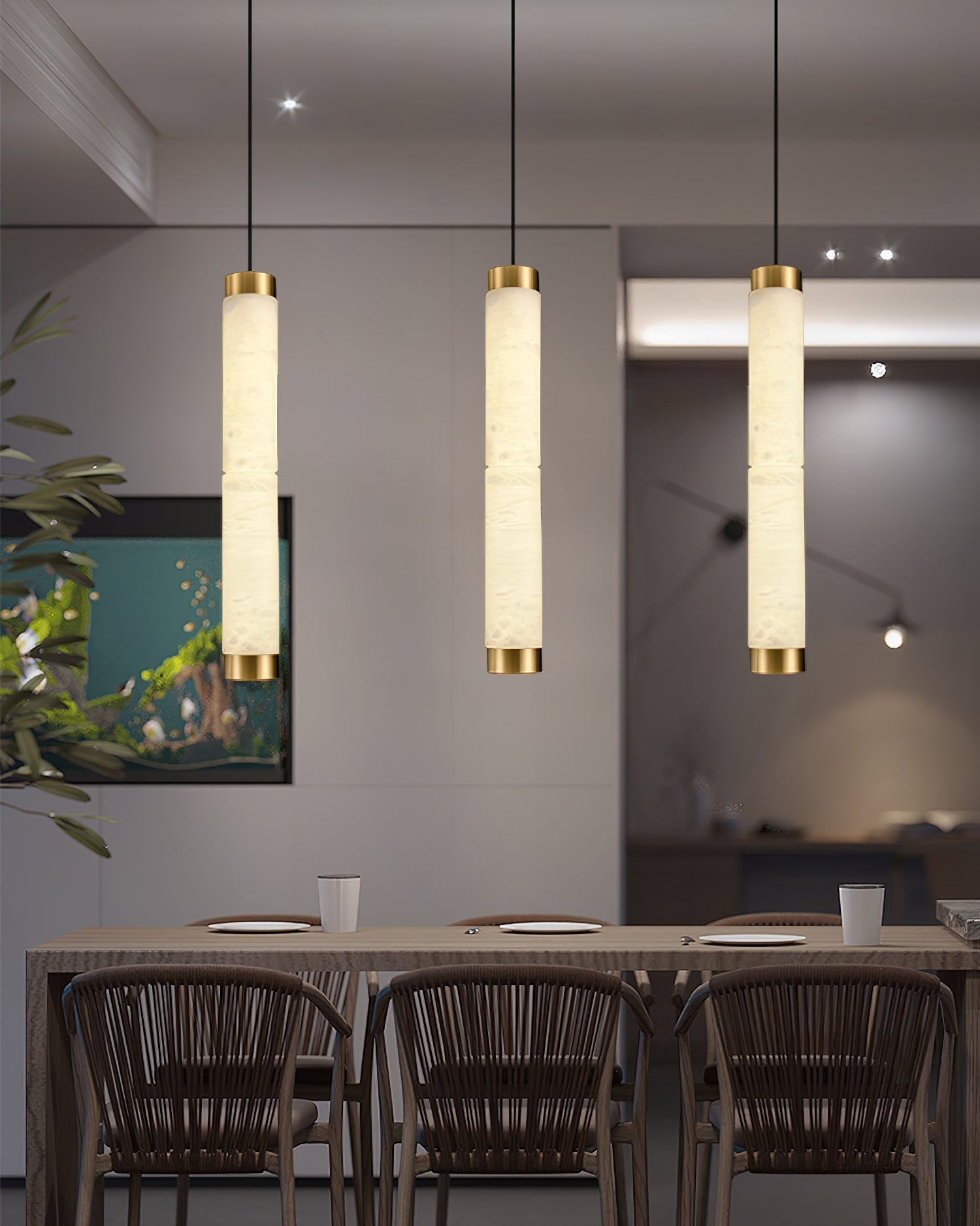 The alabaster tubes and spheres are held together by simple brass pieces in a light satin finish to produce a suspension in which the elements are positioned at varying heights. Shapes that are simple and fundamental, with lighting that accentuates the inherent veins of the alabaster. Each piece is unique, a gift from nature to adorn environments of every age and style, from the most classic to design.