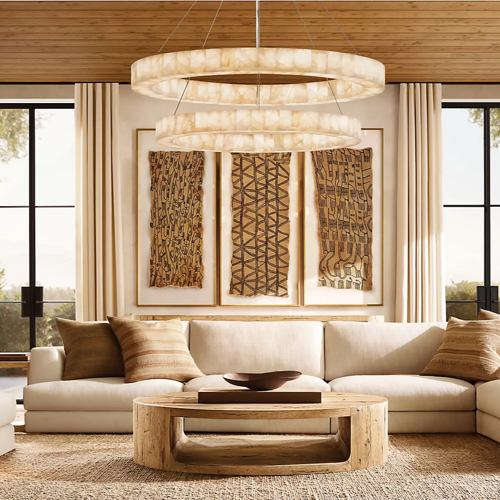 Minimalist in form and dramatic in effect, our Rivage chandelier design celebrates the beauty of calcite, a translucent stone with a warm, natural glow. Suspended from a slender steel cable, the glow of the polished stone is expertly stitched together to create a smooth, continuous surface, while subtle light from within highlights the organic colors and veins.
