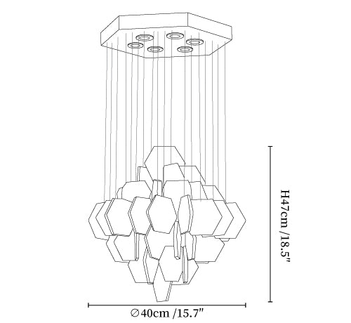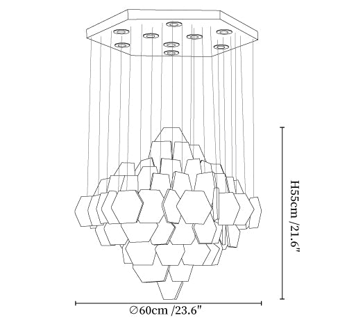 Experience luxury with the Hexa Alabaster Cascade Chandelier. Featuring hexagonal alabaster pieces suspended from a sleek gold frame, it casts a warm, diffused glow perfect for elegant dining rooms or grand entryways.