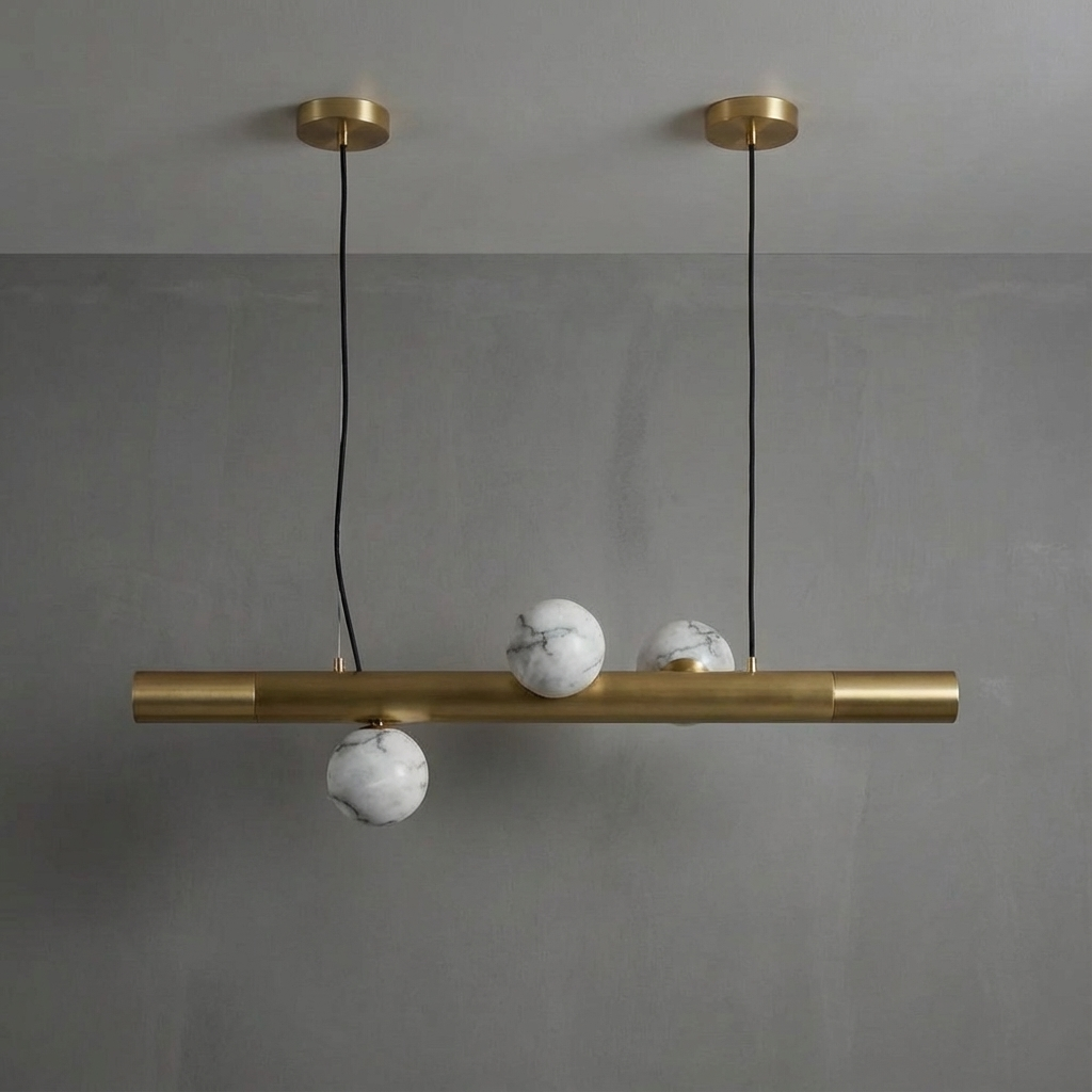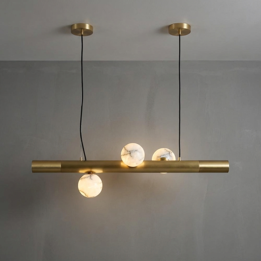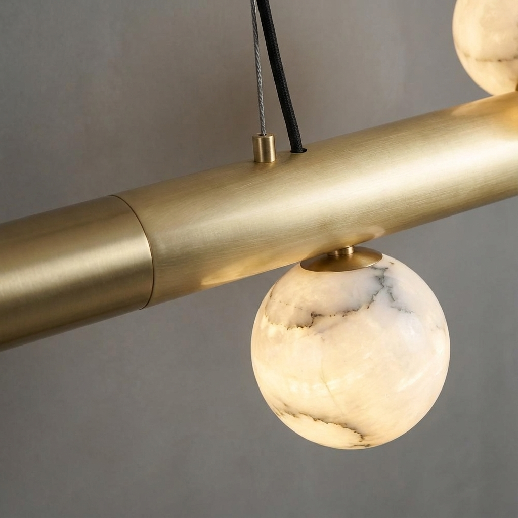 A study in quiet luxury, this pendant light features a smooth alabaster shade with subtle, natural veining reminiscent of fine stone. When illuminated, the alabaster casts a warm, diffused glow directed downward, creating an inviting ambience over kitchen islands, dining tables, or in thoughtfully grouped installations. Its straightforward silhouette and restrained detailing lend a refined, contemporary character that complements a wide range of interiors. The elongated composition is ideal for open-plan kitchens and dining spaces where a single, balanced gesture of light is desired, while the carefully considered mounting details allow the piece to appear light, effortless, and elegantly poised once installed.