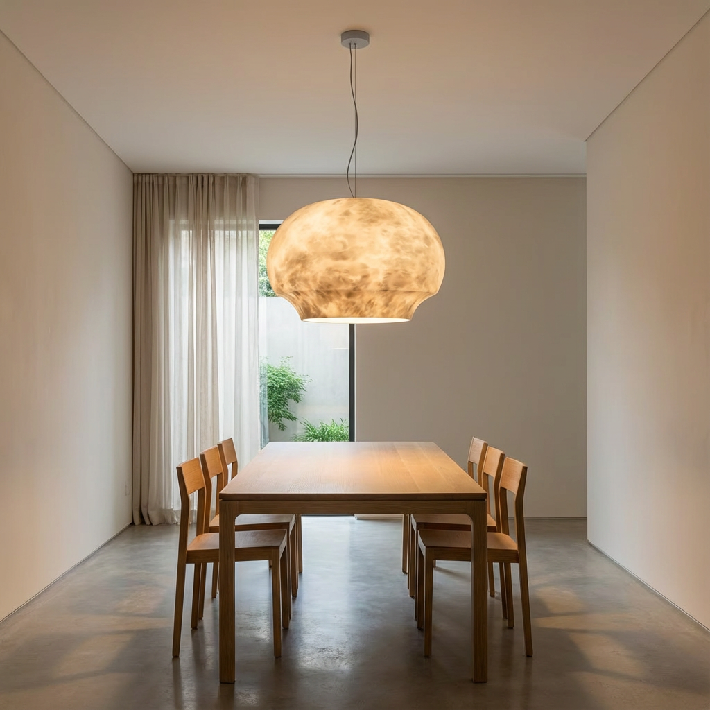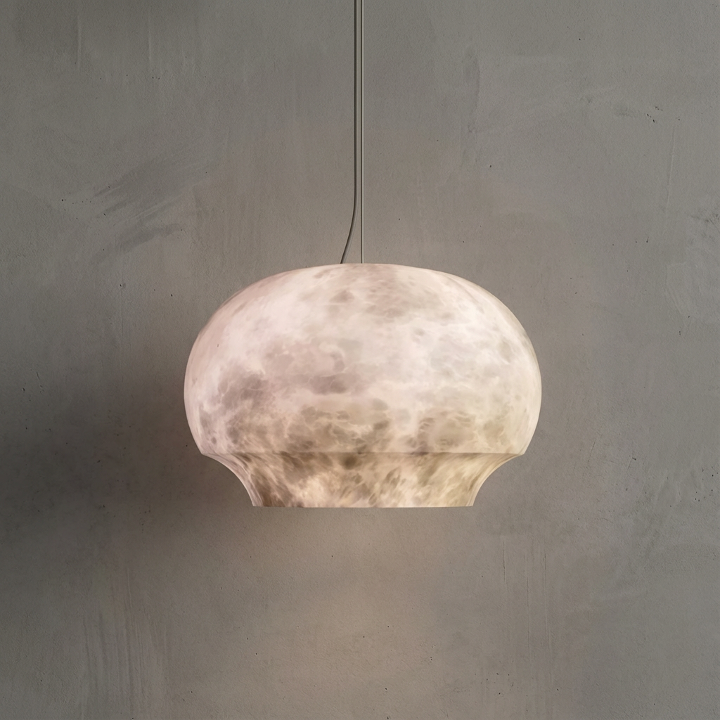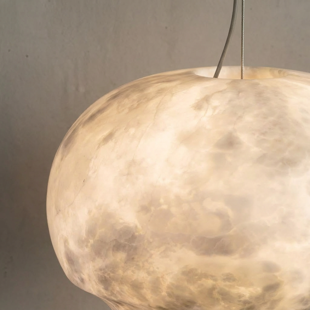 The Celine pendant showcases a rounded alabaster form offered in two diameters- and -providing flexibility for both single and grouped installations. Its clean geometry and softly diffused light create a warm, refined presence that suits kitchen islands, bedside tables, and compact dining settings. Each pendant emphasizes the natural variation of alabaster, giving every piece a unique and subtly tailored character. The elongated composition lends itself beautifully to open-plan kitchens and dining areas, where a single, balanced gesture of light can anchor the space. A compact canopy keeps the ceiling line clean and understated, allowing the alabaster form to take visual focus while maintaining a modern, elegant profile.