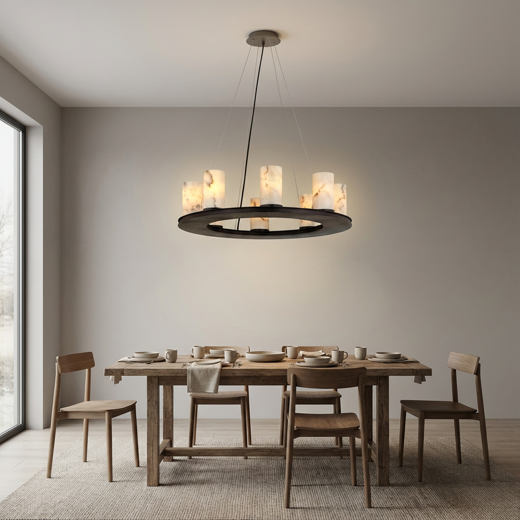Designed specifically for placement above a dining table, this chandelier combines alabaster diffusers with a streamlined structural frame to create a soft, welcoming glow. The alabaster gently filters the light, offering comfortable, diffused illumination that enhances table settings and conversations without glare. The design balances simplicity and material richness, making it an easy fit for modern dining rooms and open-plan spaces.