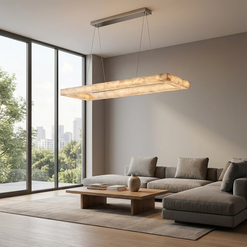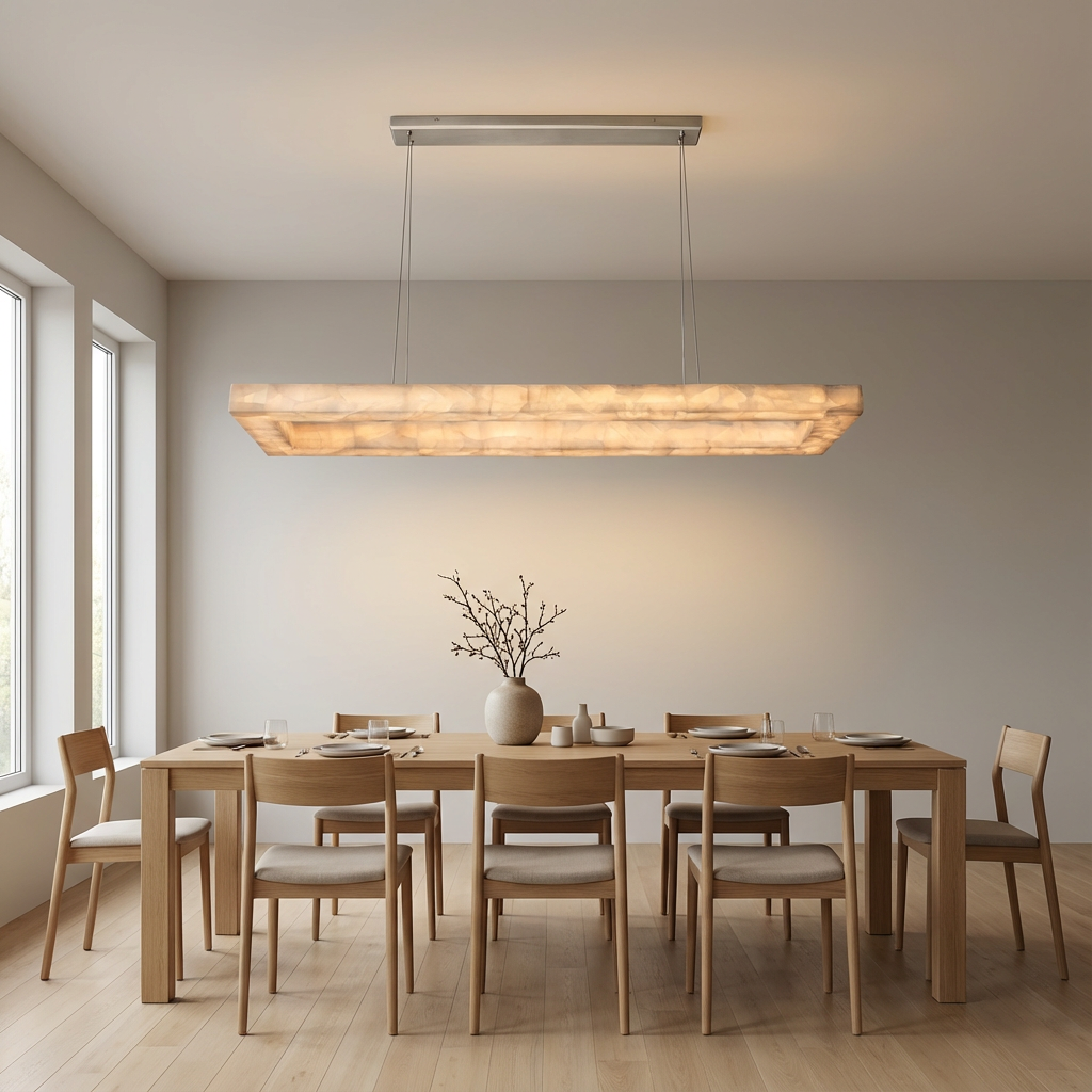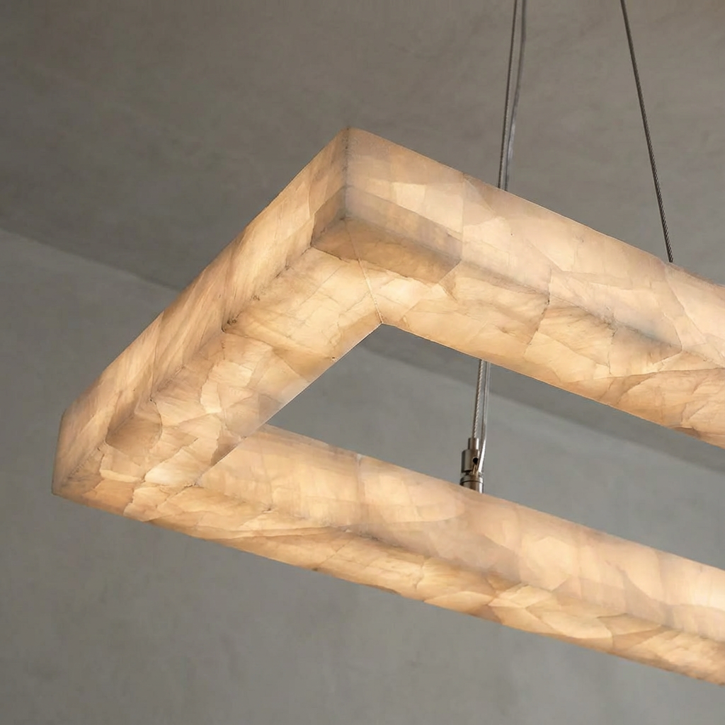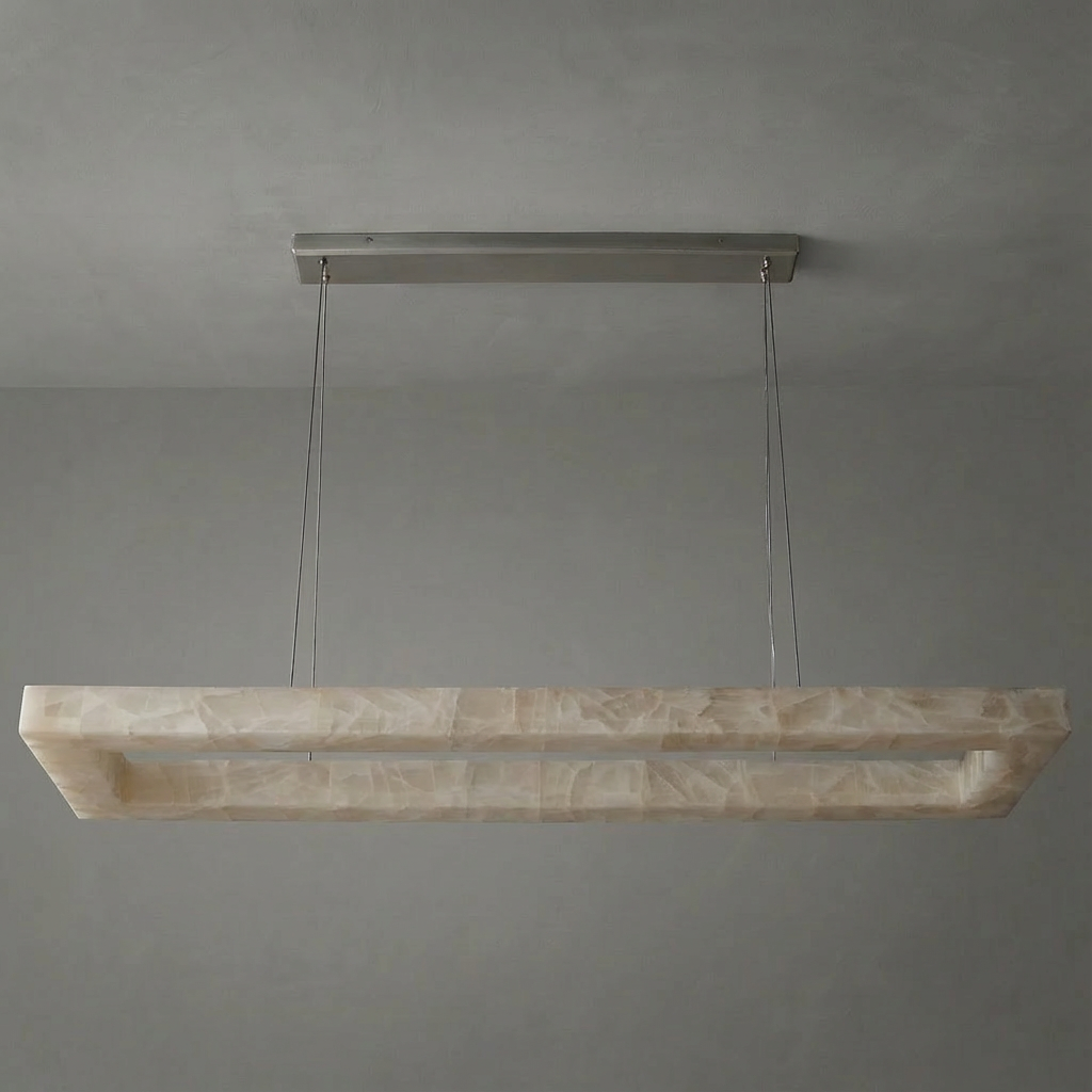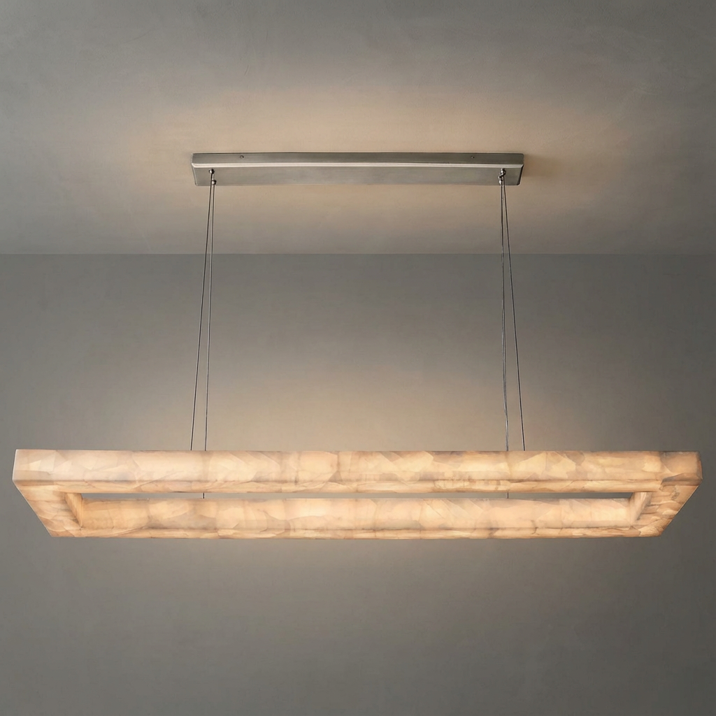 Designed for larger surfaces, this 72-inch rectangular alabaster chandelier extends its luminous composition across a generous span. The natural stone detailing creates a softly diffused glow, offering broad, balanced illumination ideal for long dining tables or expansive kitchen islands. With its clean lines and elongated form, this chandelier complements both contemporary and transitional interiors. The design is especially suited to open-plan kitchens and dining spaces where a single, cohesive gesture of light is desired. Deliberately minimal ceiling hardware keeps the focus on the illuminated alabaster, allowing the warm, sculptural presence of the fixture to define the room with understated elegance.
