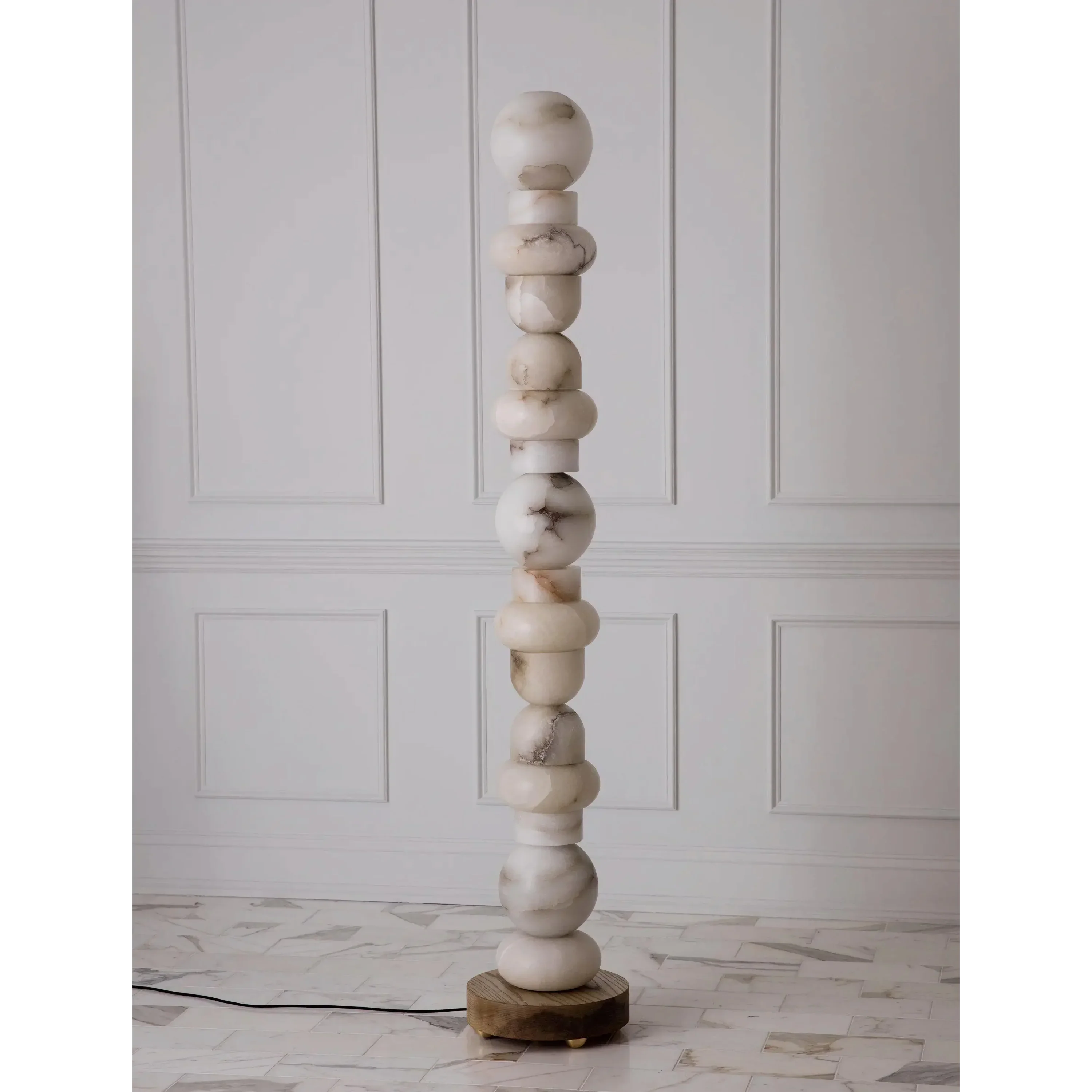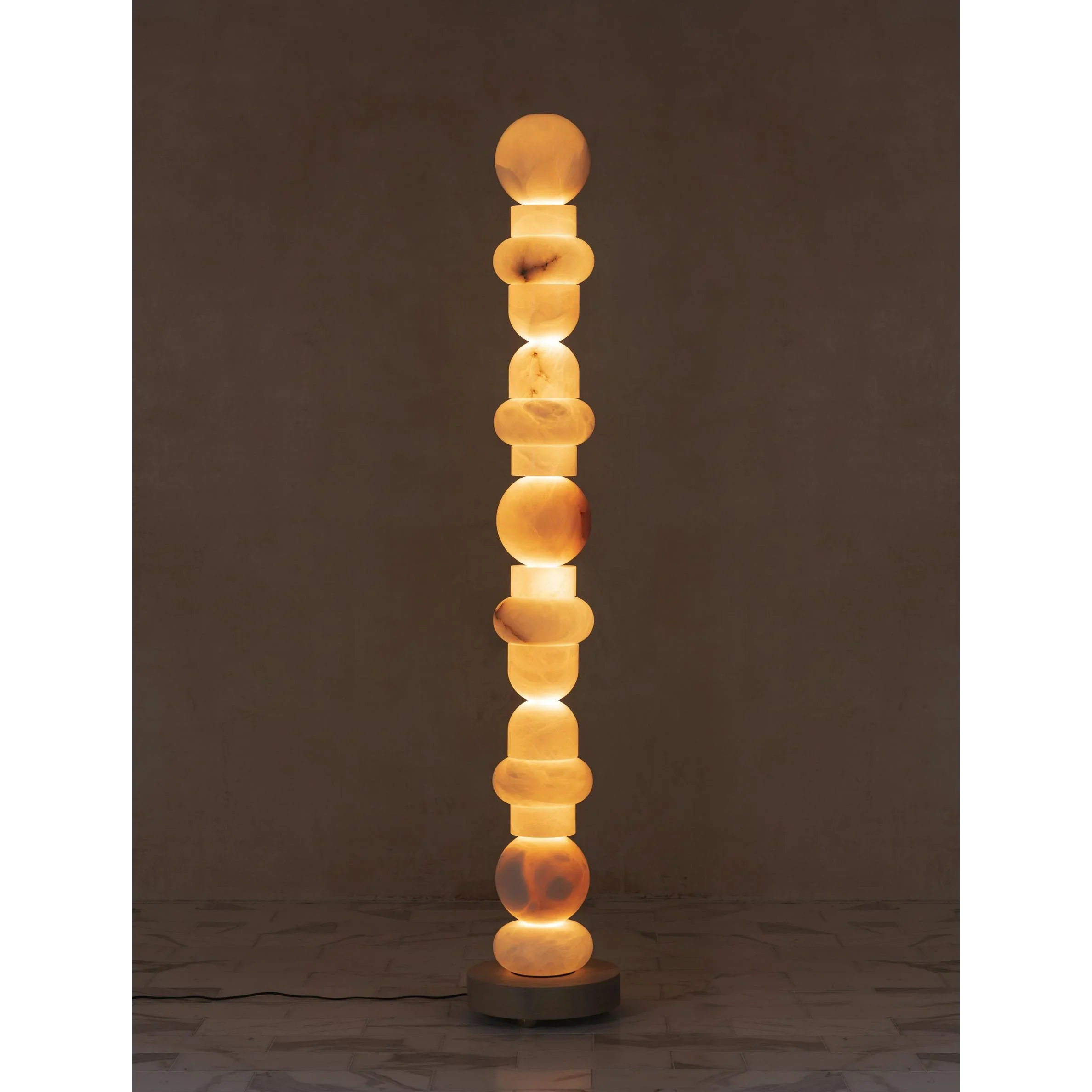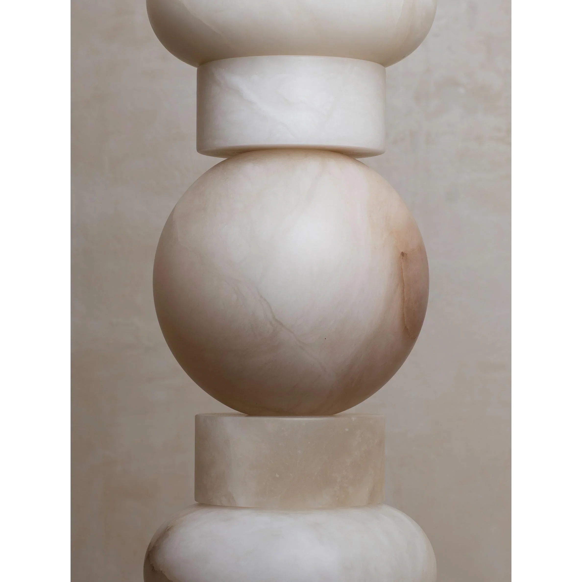The Alabaster Column Floor Lamp combines natural alabaster stone with a brass and alabaster base for a refined, elegant look. Its tiered column design softly diffuses a warm 3000K glow, illuminating spaces up to 20 m². Perfect for sophisticated living rooms, foyers, or professional settings, this lamp balances artistry with functionality, enhancing interiors with timeless natural beauty.