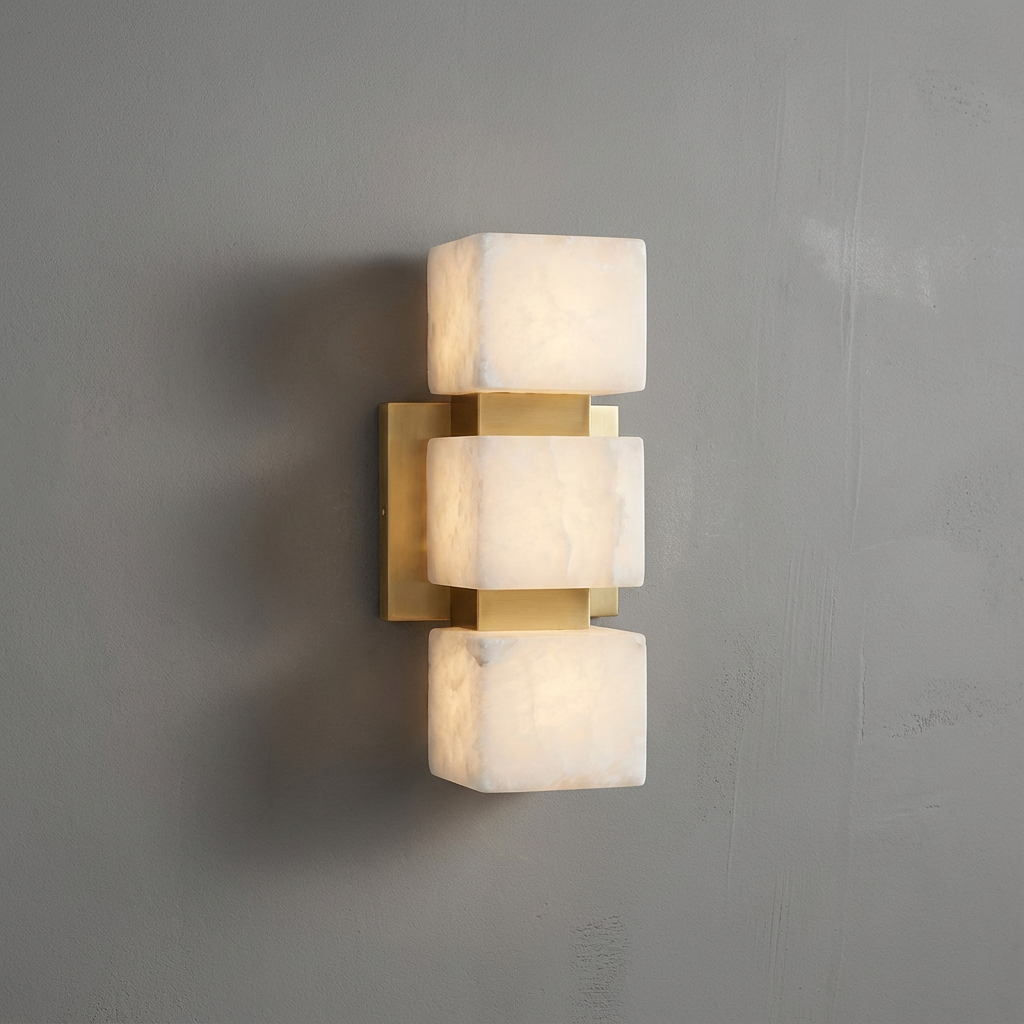 This wall sconce arranges luminous alabaster in a crisp cubic composition, casting a focused yet gentle wash of light across the wall. The refined geometric form introduces a modern, graphic presence, while the natural stone keeps the ambiance warm, soft, and inviting.