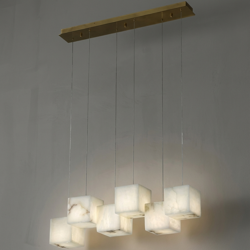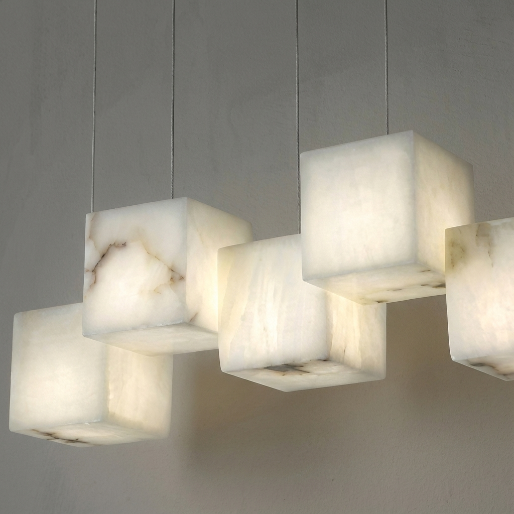 Defined by a cubic alabaster shade suspended from minimal hardware, this pendant brings a quietly luxurious presence to any space. The natural alabaster softens and diffuses the light, creating a warm, inviting glow that feels both modern and timeless. Its crisp geometry and restrained design make it equally at home as a single focal point or arranged in multiples over counters and bars. Whether grouped at staggered heights or hung alone, it adapts effortlessly to entries, stairwells, or intimate reading corners that call for a refined accent. Thoughtfully considered mounting details allow the piece to appear light and effortless once installed, complementing contemporary and minimalist interiors that favor clean lines and natural material accents.