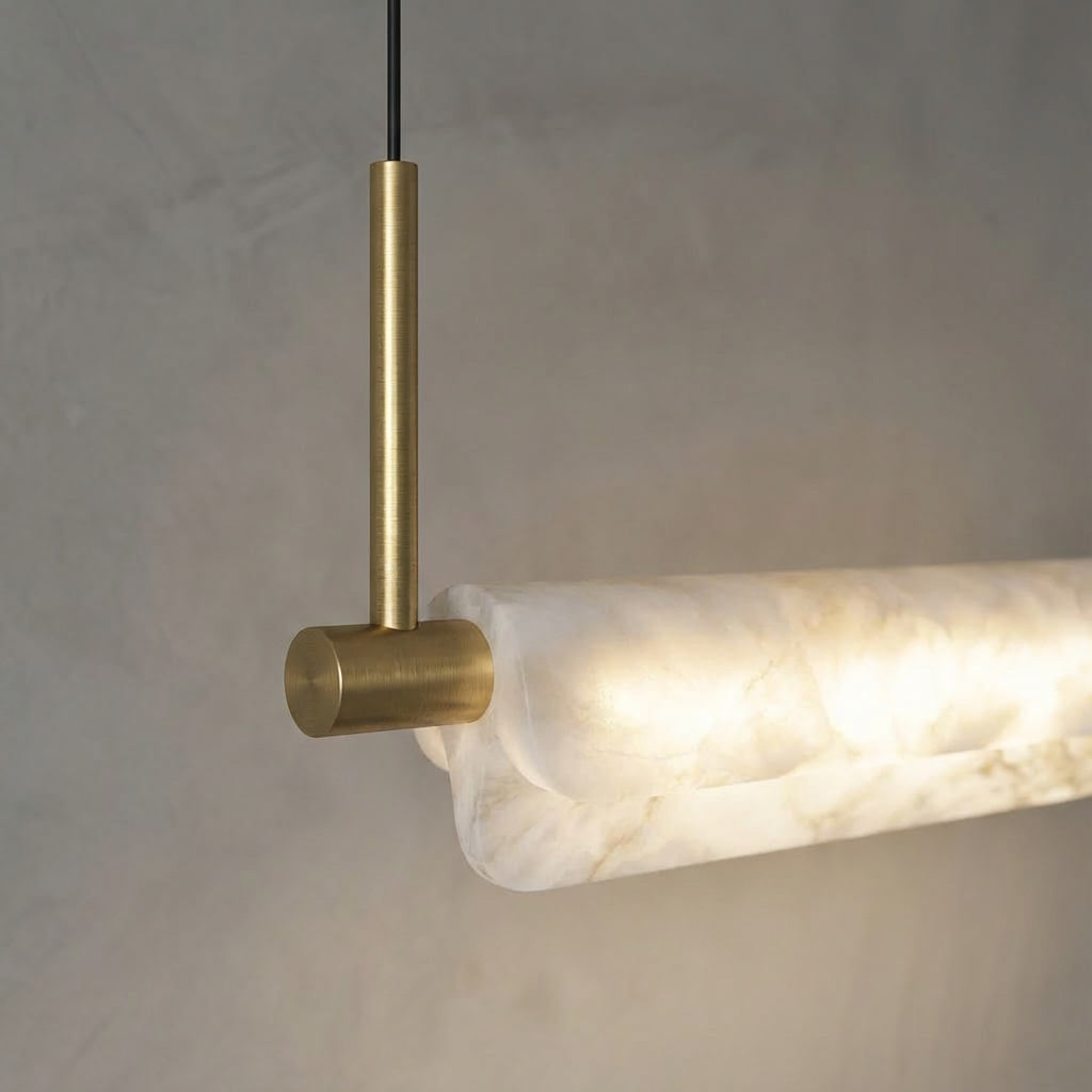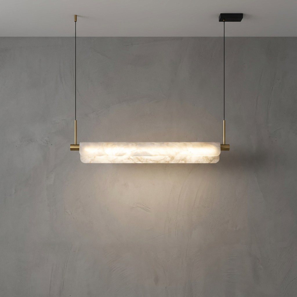 Designed at 39 inches in length, this linear chandelier is ideal for smaller dining tables and compact kitchen islands. Thoughtfully proportioned, it maintains a sense of balance and scale in modest spaces, delivering consistent illumination without overwhelming the room or crowding sightlines. Carefully arranged alabaster elements provide soft, glare-free light, bringing a natural warmth and subtle texture to the design. Clean lines and refined detailing support a modern yet inviting aesthetic, allowing the illuminated alabaster to take center stage. Minimal ceiling hardware keeps the overall look streamlined so the eye rests on the glowing linear form. Perfect over dining tables, kitchen islands, or long work surfaces, this chandelier introduces an elevated, understated presence to contemporary interiors.