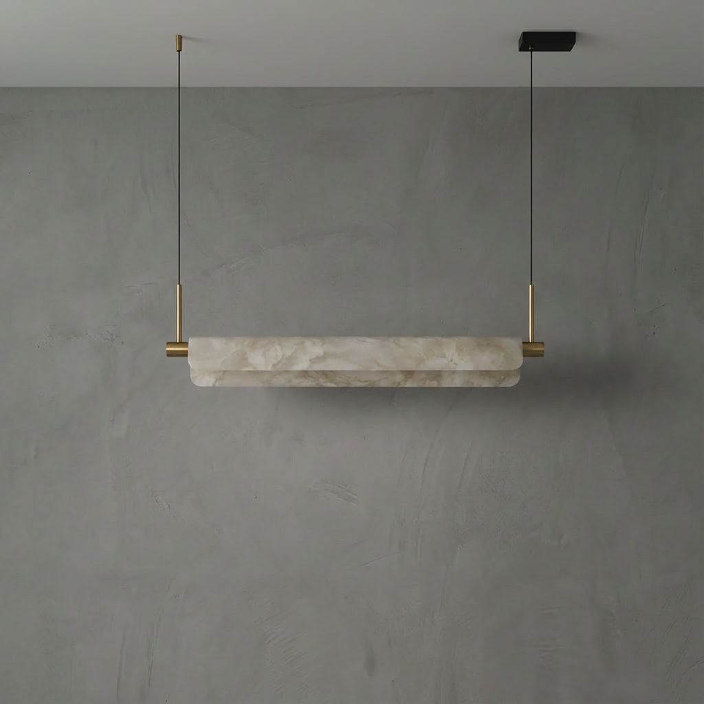 Carefully arranged alabaster elements provide soft, glare-free light, bringing a natural warmth and subtle texture to the design. Clean lines and refined detailing support a modern yet inviting aesthetic, allowing the illuminated alabaster to take center stage. Minimal ceiling hardware keeps the overall look streamlined so the eye rests on the glowing linear form. Perfect over dining tables, kitchen islands, or long work surfaces, this chandelier introduces an elevated, understated presence to contemporary interiors.
