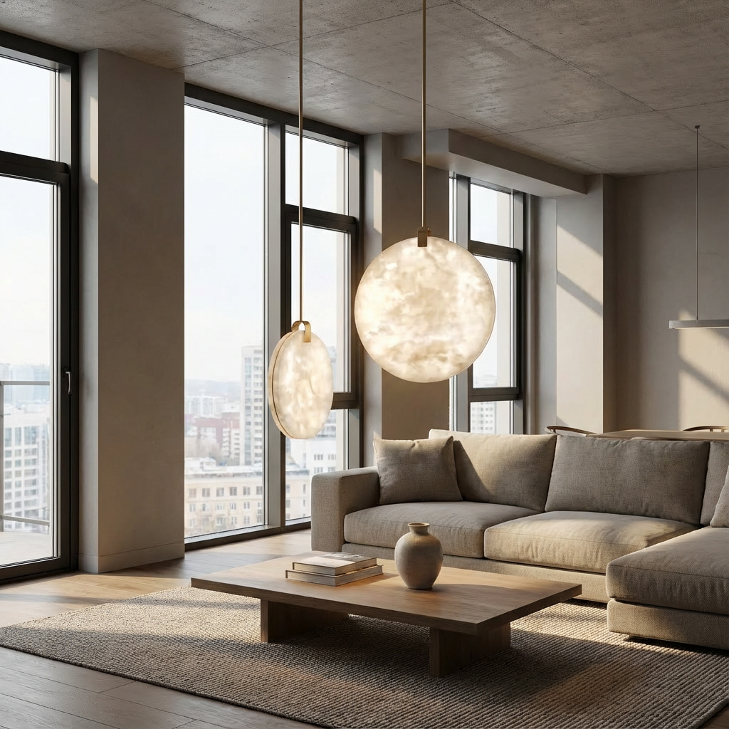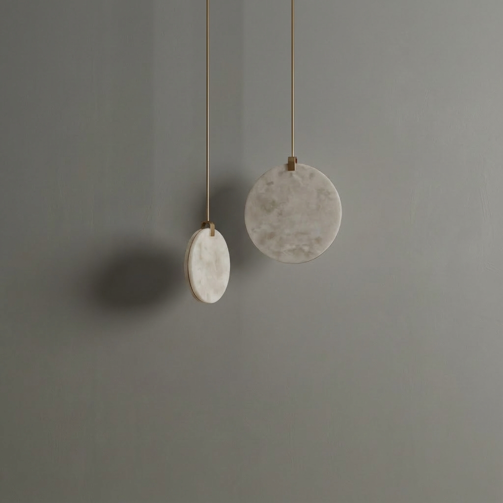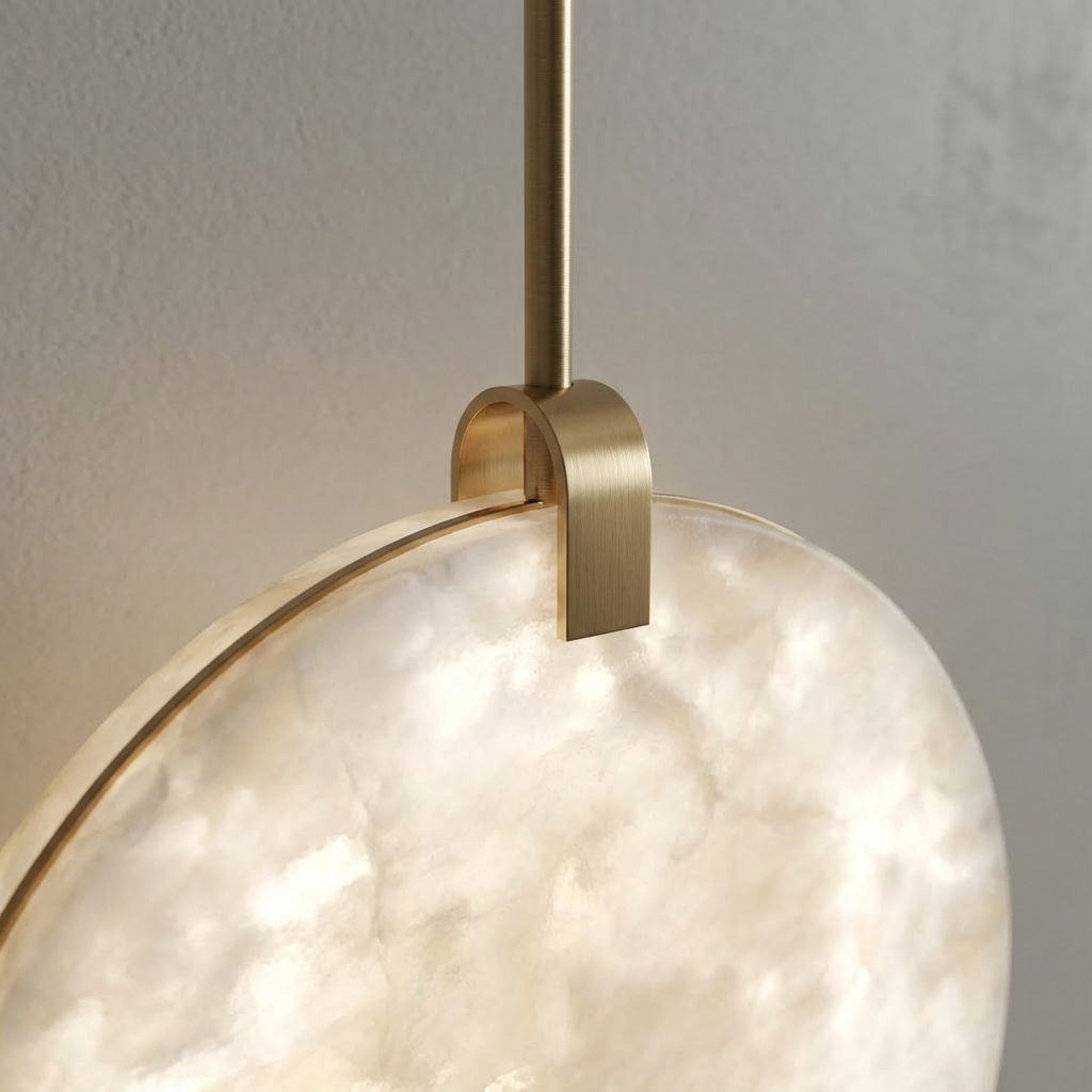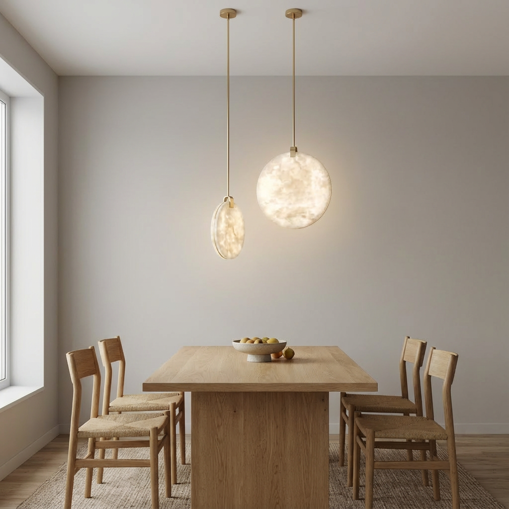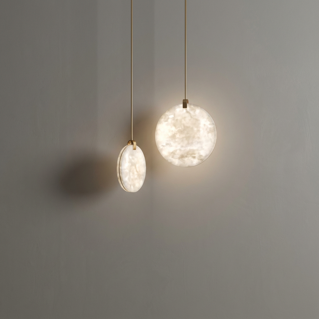 Crafted from natural alabaster, the Alabaster Disc Pendant Light casts a warm, evenly diffused glow that gently enhances contemporary interiors. The subtle veining of the alabaster adds depth and character, making each piece visually unique while maintaining a soft, inviting ambiance. Defined by clean geometry and restrained detailing, this pendant offers a refined, architectural presence. Its minimalist form and carefully considered mounting details allow it to appear light and effortless once installed, quietly elevating the space rather than overpowering it. Equally striking on its own or grouped in staggered heights, the Alabaster Disc Pendant Light adapts easily to entries, stairwells, and reading corners that call for a sophisticated focal point. Its versatile design makes it an elegant solution wherever a modern, understated accent is desired.