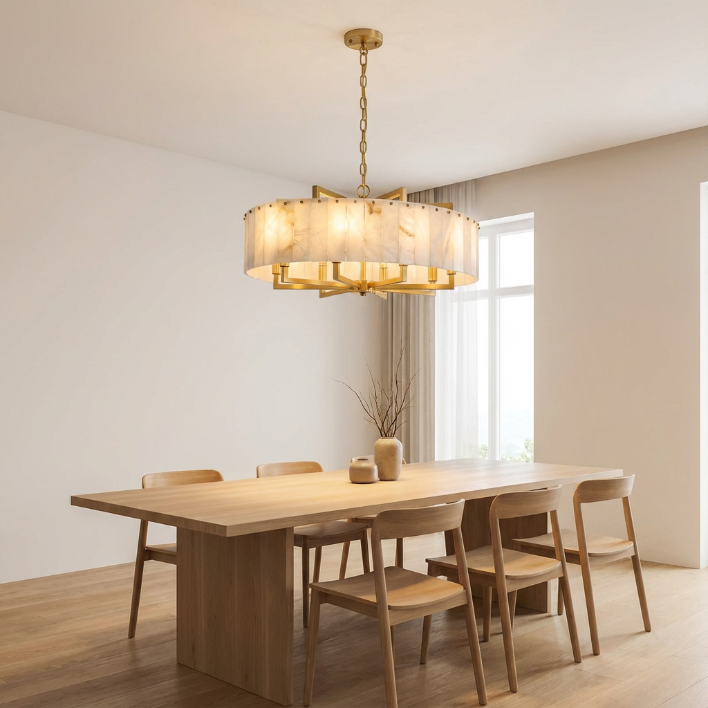 Defined by clean geometry and restrained detailing, this chandelier brings a refined, architectural presence to the room. The brass detailing frames the stone with a gentle contrast, keeping the overall impression tailored, modern, and visually balanced. Whether hung low over a dining table or positioned higher in an open volume, it introduces a composed focal point that ties the room together. Refined mounting details ensure the piece feels light and effortless once installed, allowing the alabaster and brass materials to take center stage.