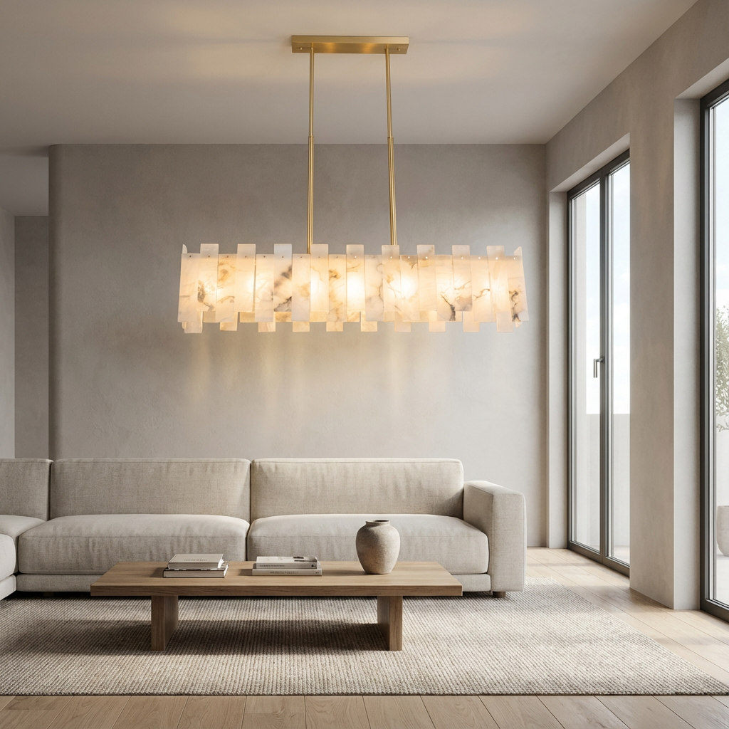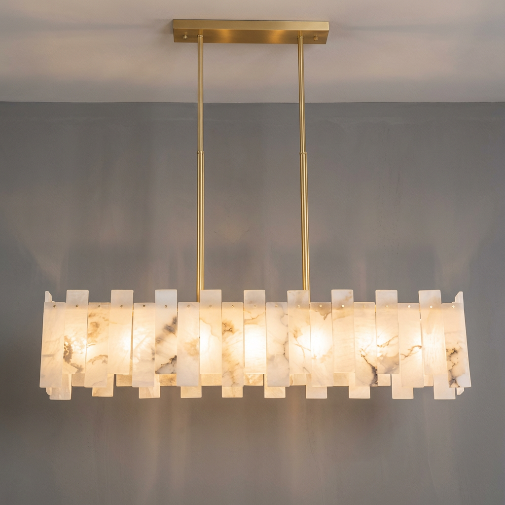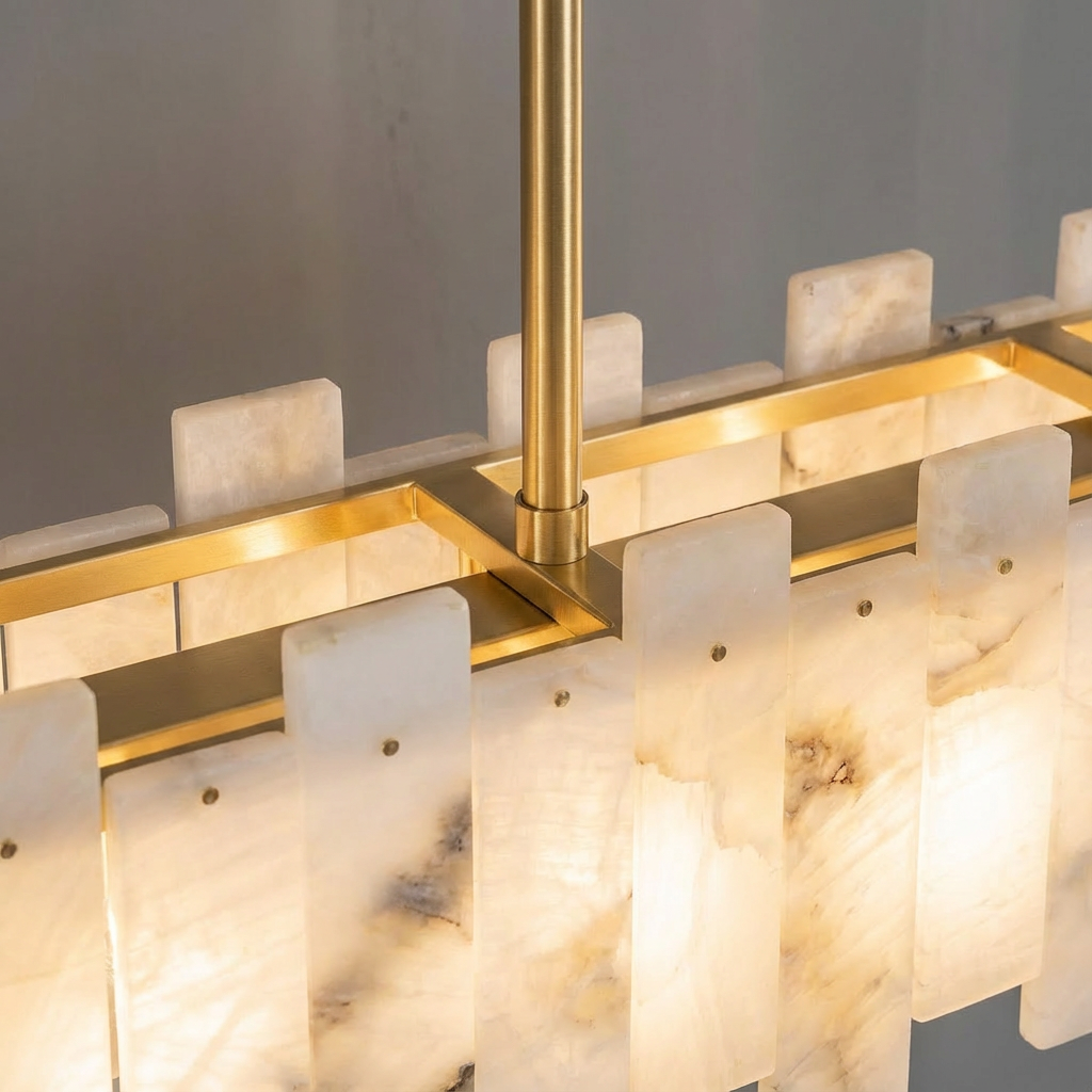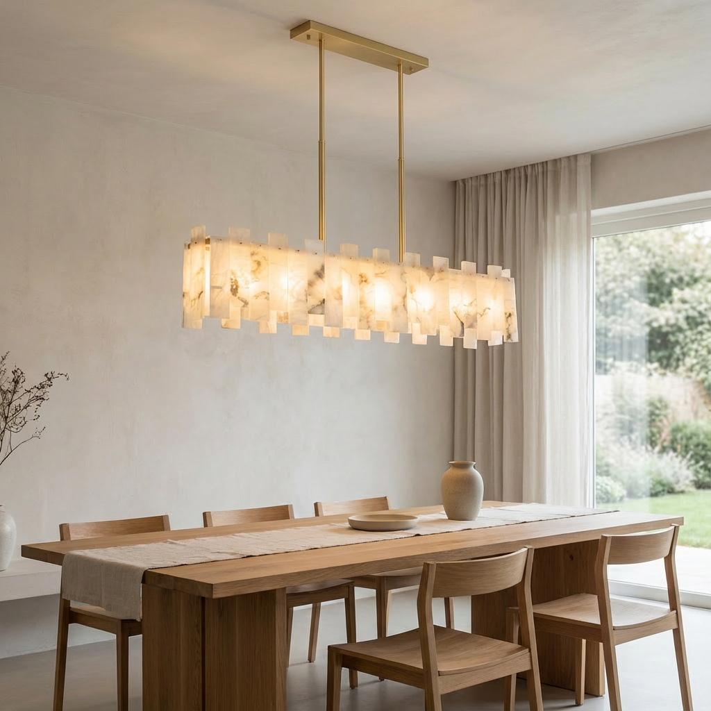 Crafted from natural alabaster, the Alabaster Flake Modern Rectangular Dining Room Chandelier brings a warm, evenly diffused illumination to contemporary interiors. The alabaster's subtle veining and soft glow create an inviting ambiance that enhances both everyday dining and special occasions. Defined by clean geometry and restrained detailing, this chandelier has a refined, architectural presence that feels modern yet timeless. As a central fixture in living or dining rooms, it offers a warm focal point that is intentional but never overpowering. Deliberately minimal ceiling hardware keeps the emphasis on the illuminated alabaster form, allowing the light itself to take center stage and harmonize effortlessly with a variety of interior styles.