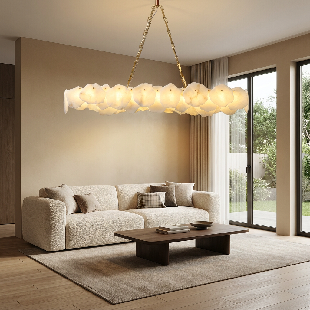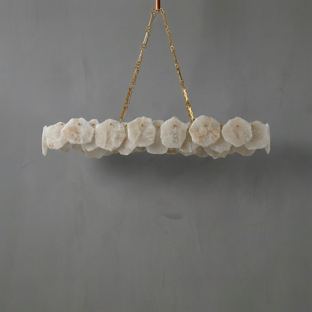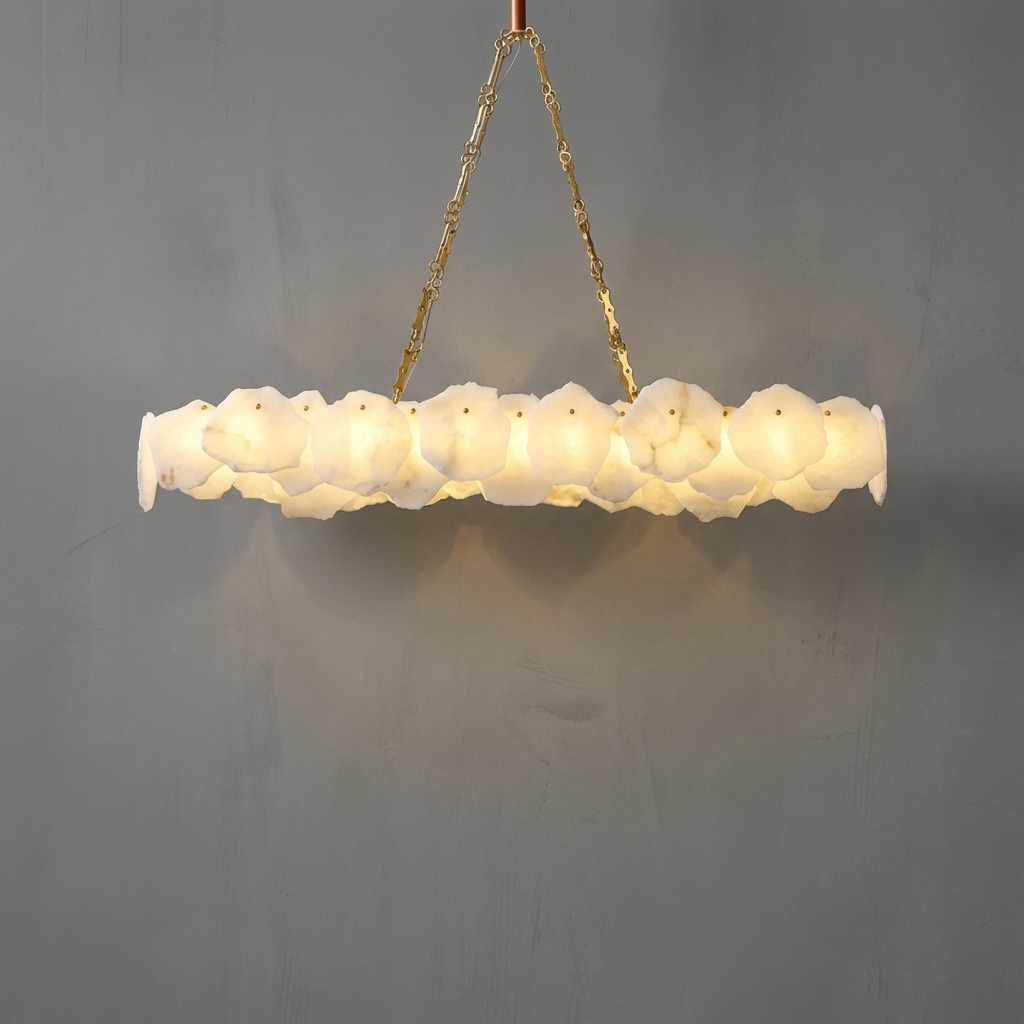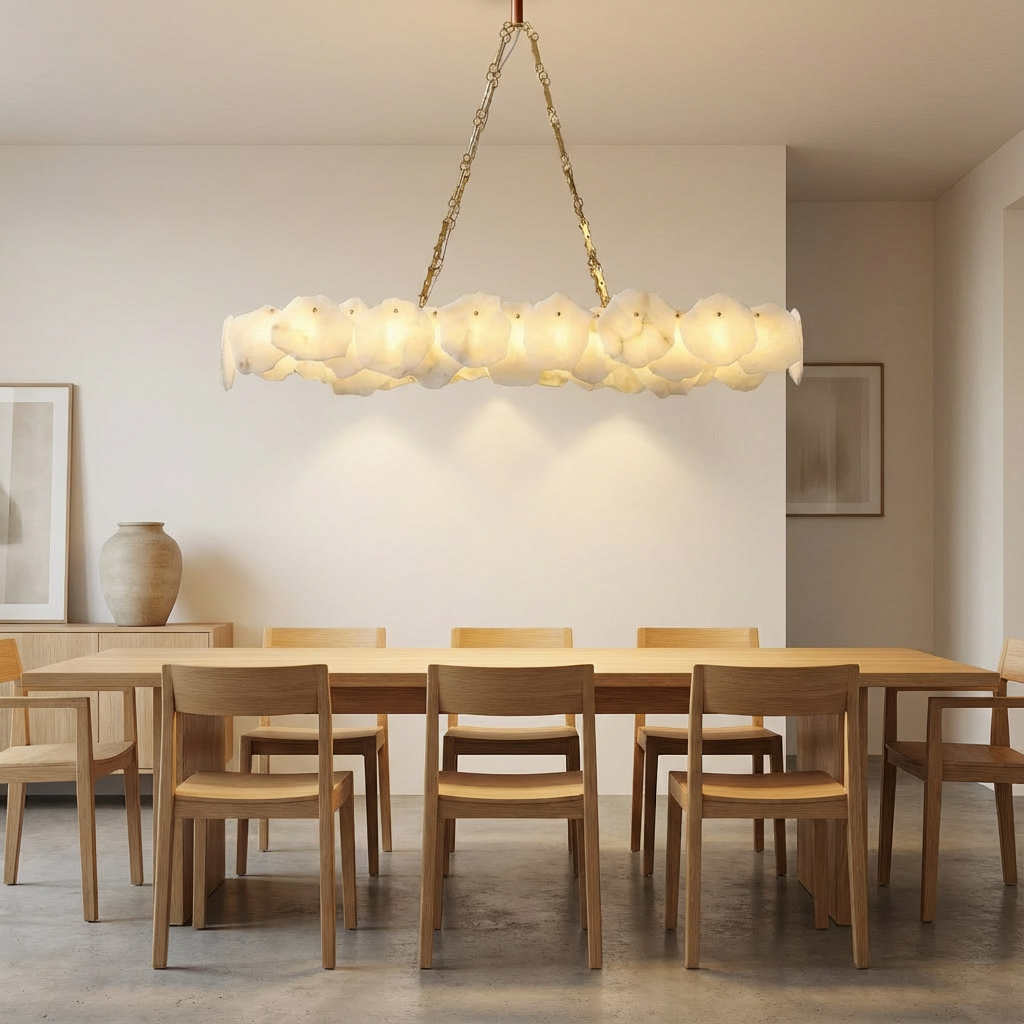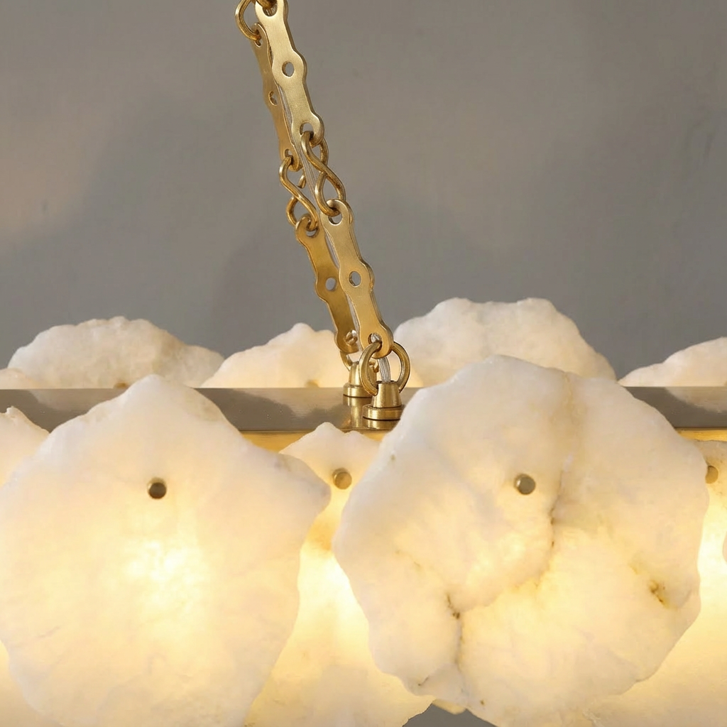 Crafted from natural alabaster, the Alabaster Flakes Linear Chandelier- Chain casts a warm, evenly diffused illumination that beautifully enhances contemporary interiors. The unique character of the alabaster brings depth and softness to the light, creating an inviting atmosphere across the room. Defined by clean geometry and restrained detailing, this chandelier has a refined, architectural presence that feels both modern and timeless. Its elongated composition is ideal for open-plan kitchens and dining spaces, where a single, balanced gesture of light is desired above an island or table. The ceiling hardware is kept deliberately minimal, allowing the eye to rest on the illuminated alabaster form. The result is a quietly luxurious fixture that anchors a space with subtle sophistication.