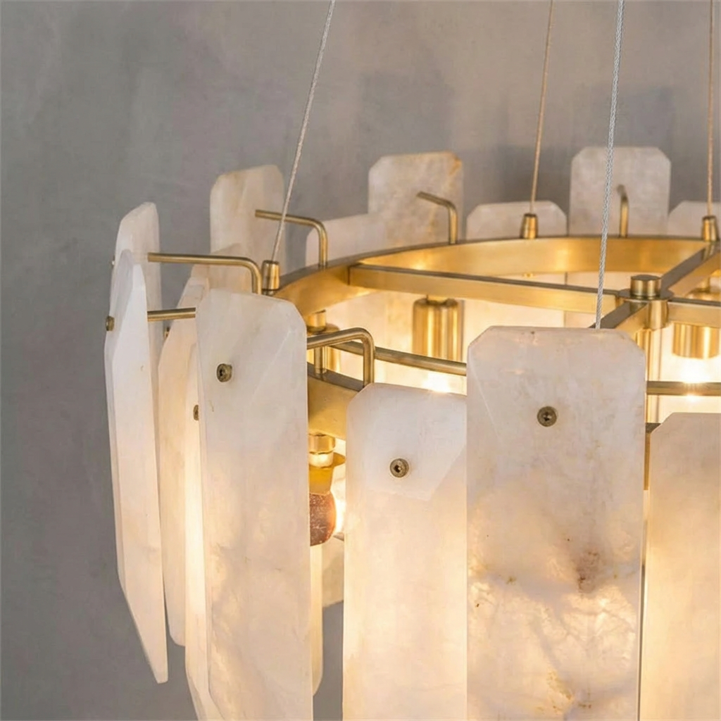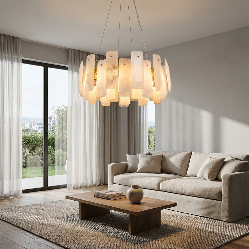 The Alabaster Flakes Round Chandelier is crafted from natural alabaster, creating a warm, evenly diffused illumination that beautifully complements contemporary interiors. The subtle veining of the alabaster brings a soft, organic character to its glow, enhancing both intimate and open spaces.