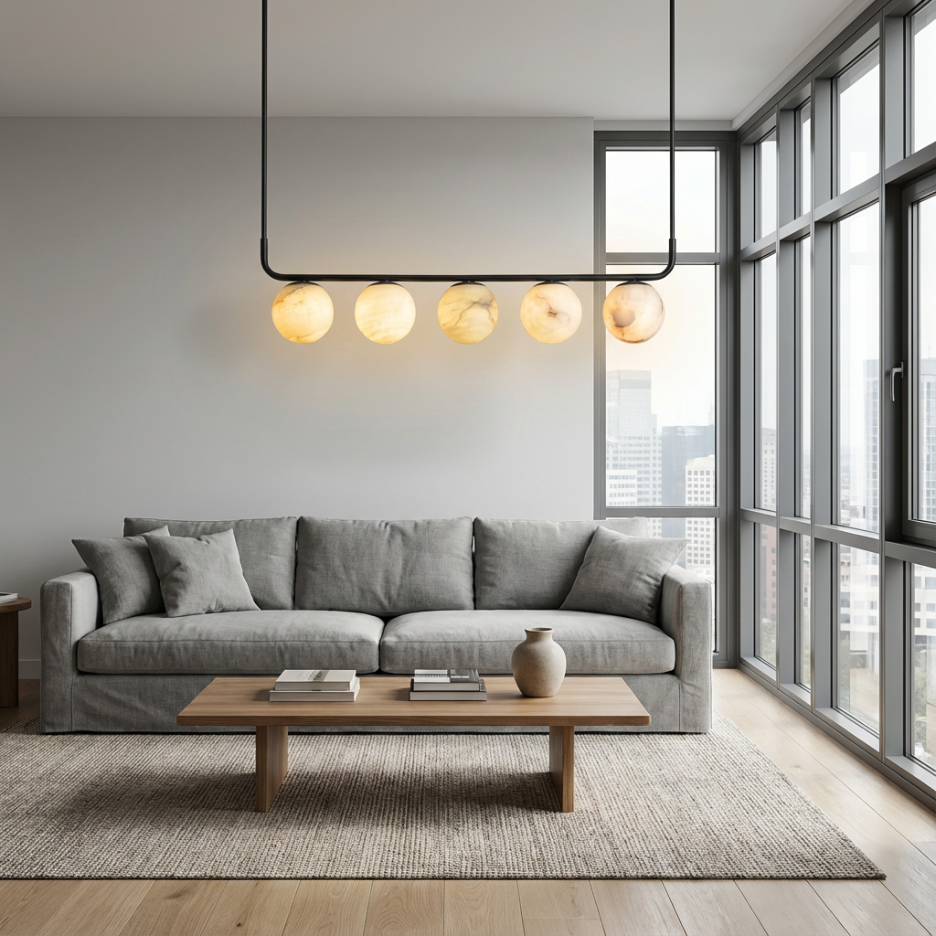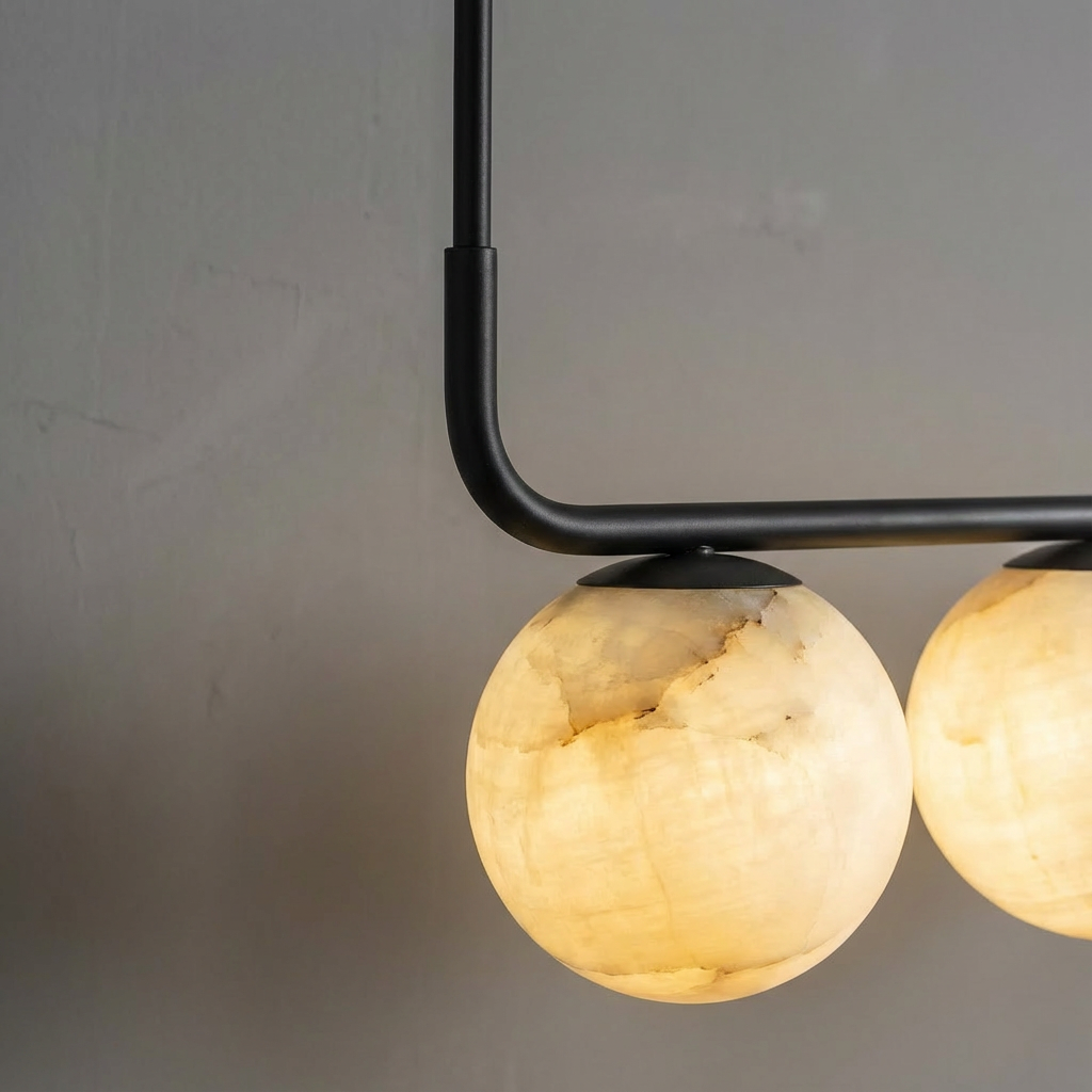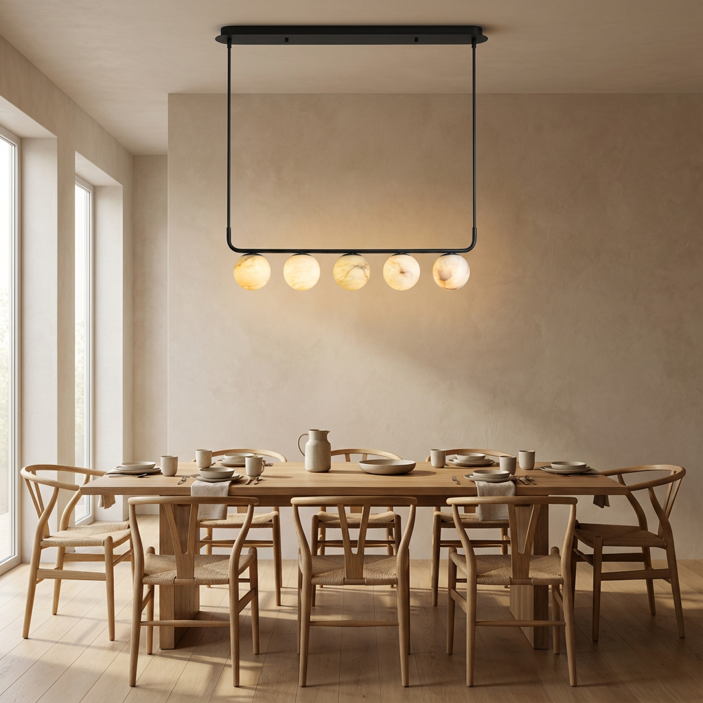 Alabaster Global Linear Chandelier H is crafted from natural alabaster, offering a warm, softly diffused illumination that enhances contemporary interiors. The inherent variation within the alabaster lends each fixture a subtle, one-of-a-kind character while maintaining a calm, cohesive glow. Defined by clean geometry and restrained detailing, this chandelier has a refined, architectural presence. Its elongated composition is ideal for open-plan kitchens, dining spaces, and gathering areas where a single, balanced gesture of light is desired. A compact canopy keeps the ceiling line clean and understated, allowing the alabaster elements and linear form to take visual precedence. The result is a modern, elegant statement piece that feels both sculptural and quietly sophisticated.