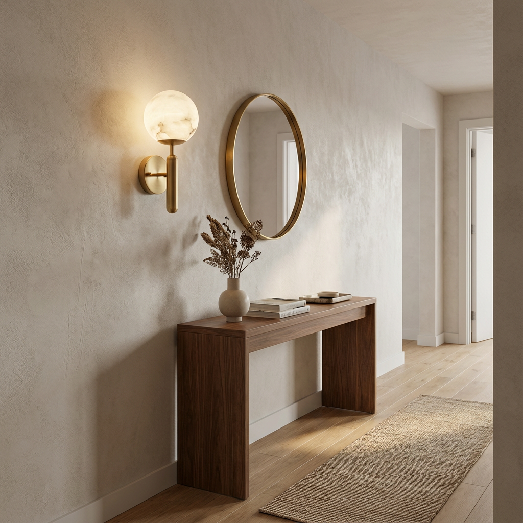 Crafted from natural alabaster, the Alabaster Global Wall Light for Bedroom offers a warm, evenly diffused glow that enhances contemporary interiors. The unique character of alabaster lends a soft, inviting ambiance, ideal for creating a calm and restful atmosphere.