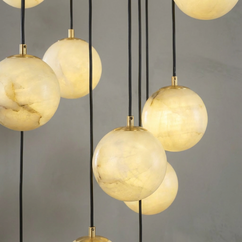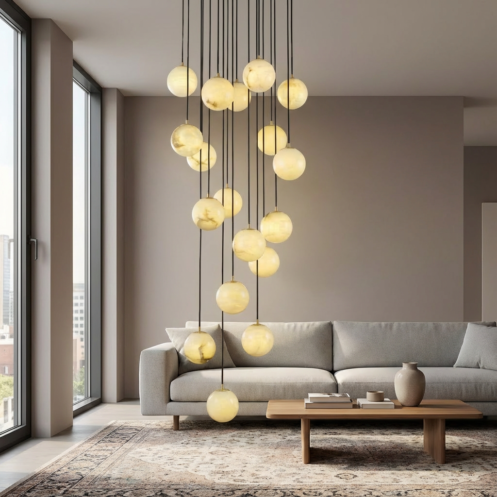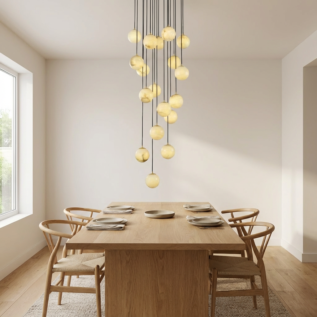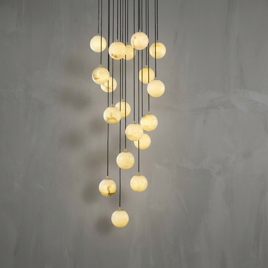 A sculptural chandelier composed of undulating alabaster elements, this piece forms a continuous, flowing profile that feels both refined and effortless. The natural beauty of alabaster is highlighted in every curve, lending a soft, organic character to its modern silhouette. The wavy geometry gently diffuses the light into subtle bands, creating a warm, atmospheric layer of illumination above dining tables or open living areas. Its elongated form is ideal for contemporary interiors that favor movement and understated visual drama. Whether hung low over a table or higher in an open volume, it brings a composed, cohesive presence that quietly ties the room together. Refined mounting details keep the overall look light and airy, allowing the chandelier to appear as if it were floating once installed.