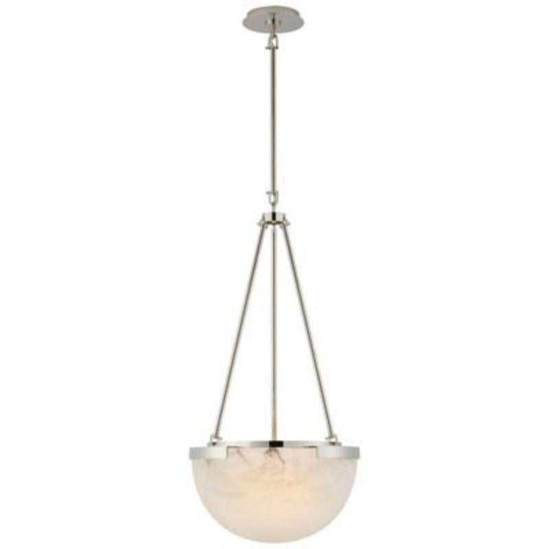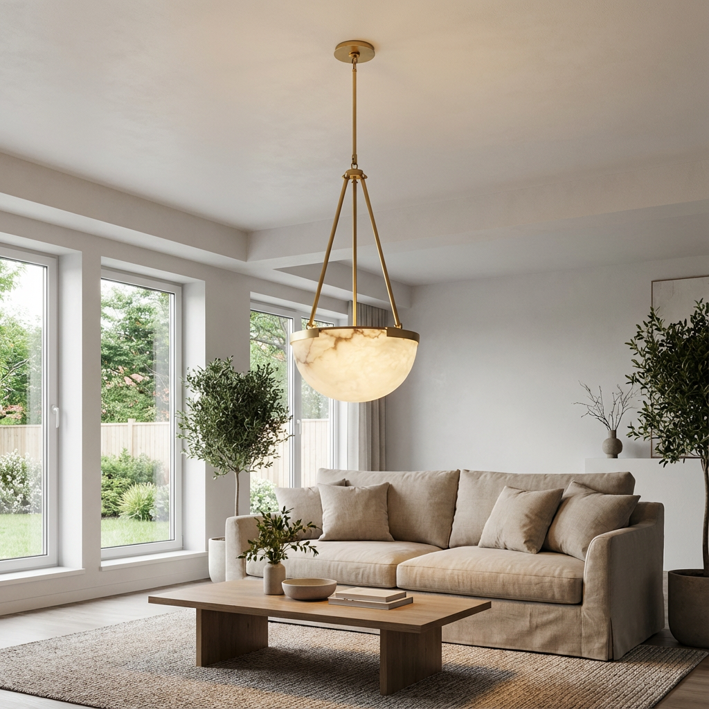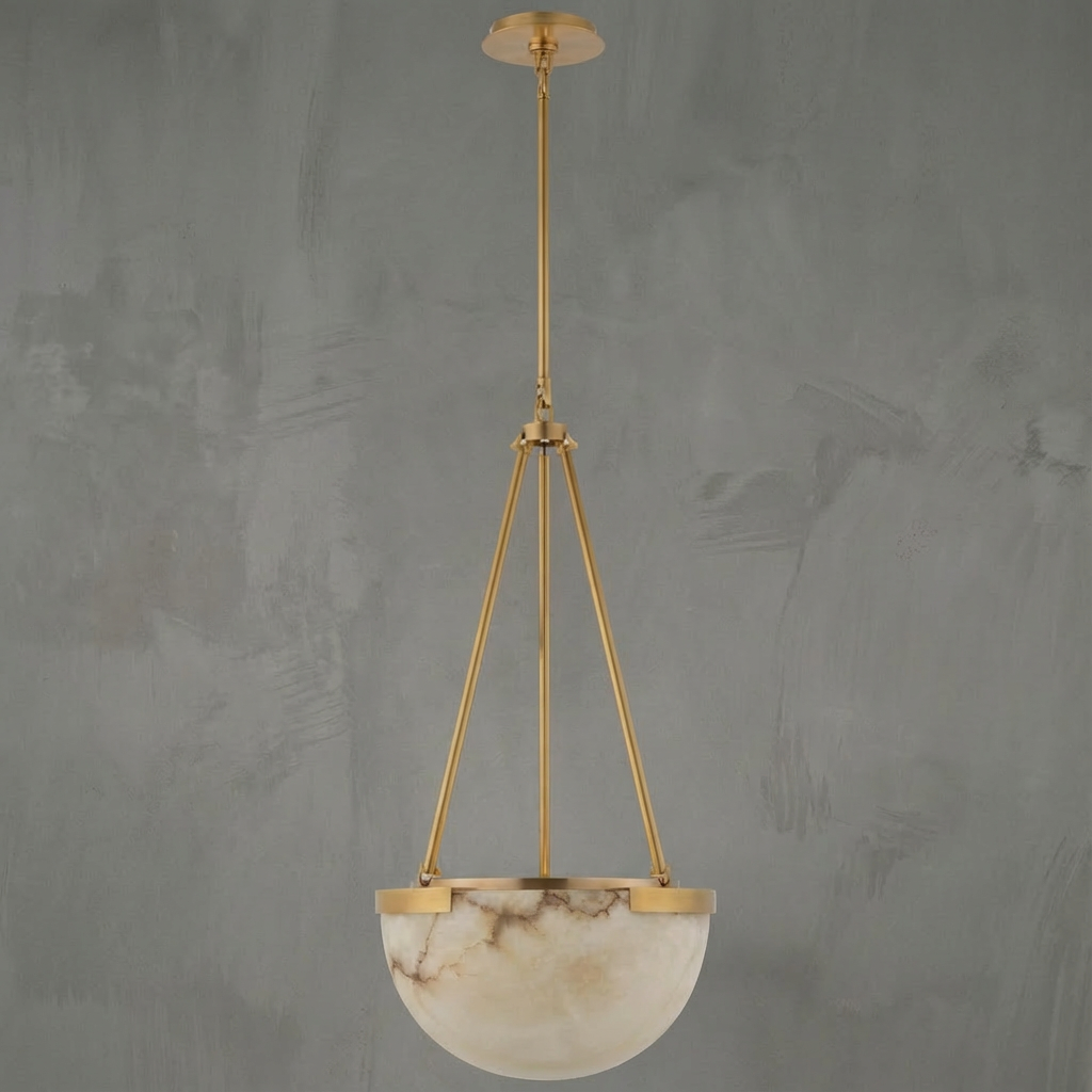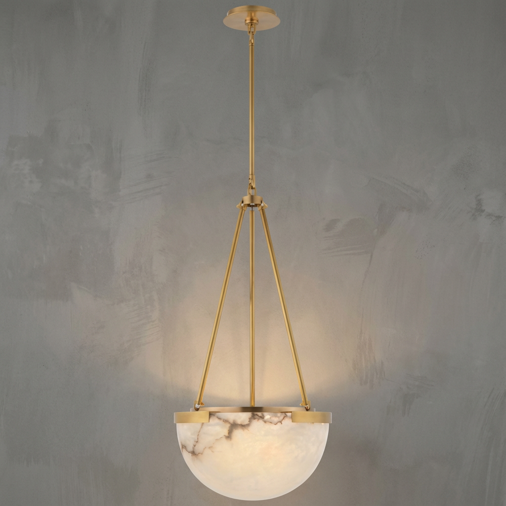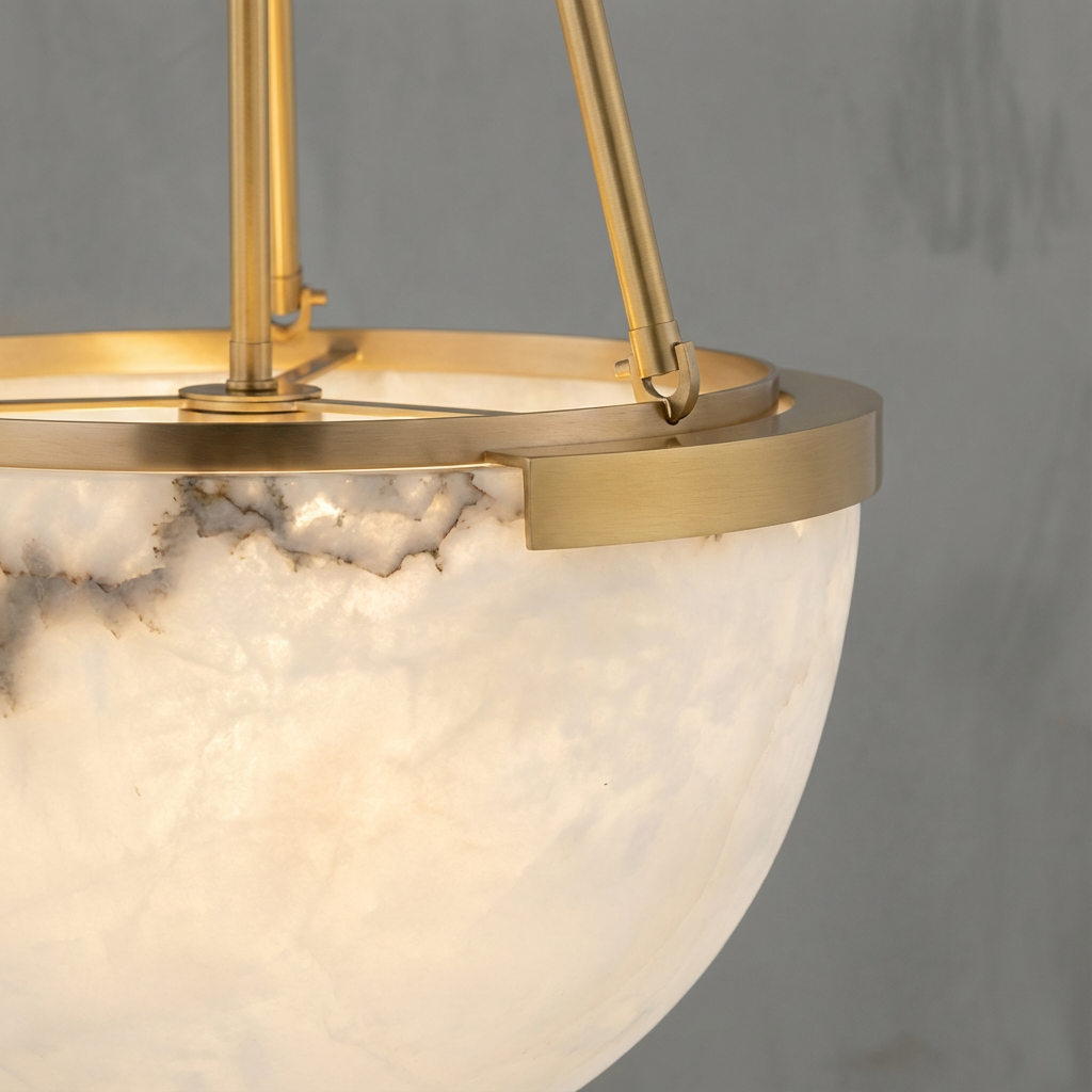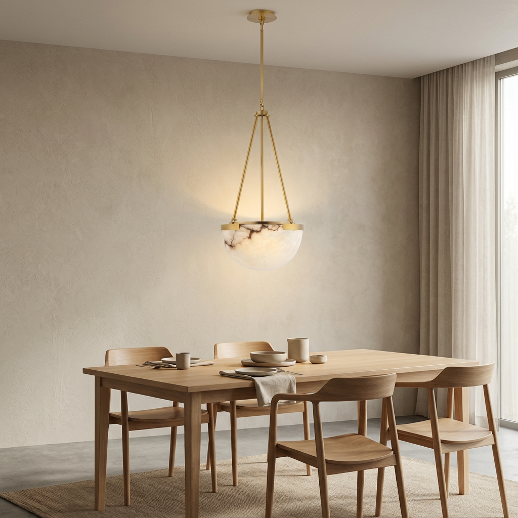 A single alabaster globe is suspended as a compact pendant, ideal for targeted yet comfortable illumination. When lit, the smooth alabaster surface reveals delicate natural veining, adding quiet texture and a sense of depth to the surrounding space. This small-scale fixture is well-suited for use in pairs, over counters, or as a refined accent within layered lighting schemes. Hung singly over a side table or in multiples along a counter, it introduces a focused pool of light with an inviting, ambient edge. A compact canopy keeps the ceiling line clean and understated, allowing the alabaster globe to take visual focus while maintaining a modern, elegant presence.