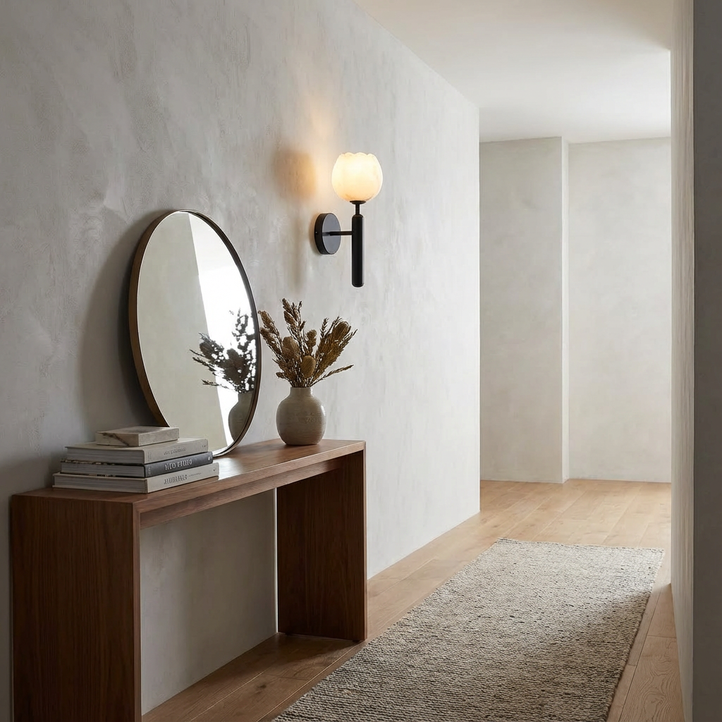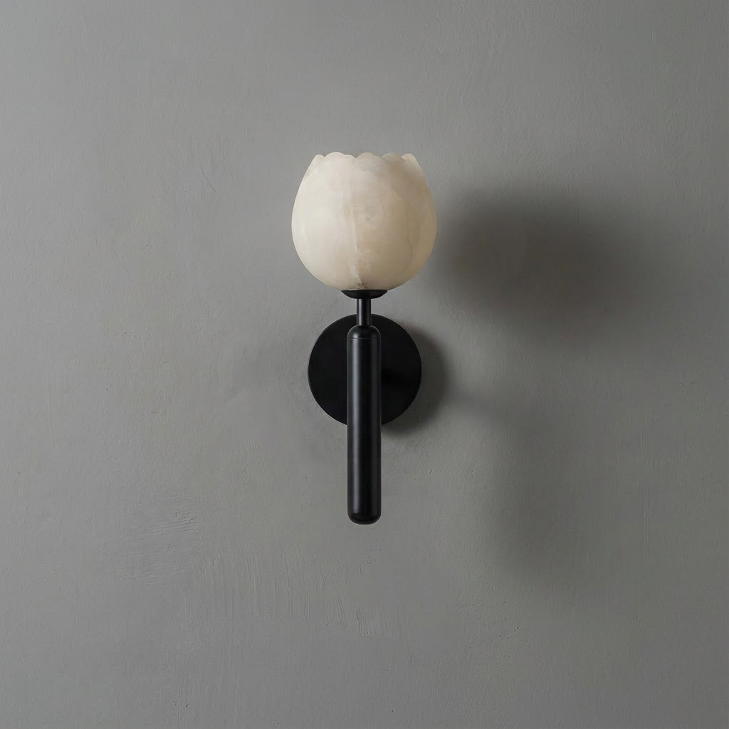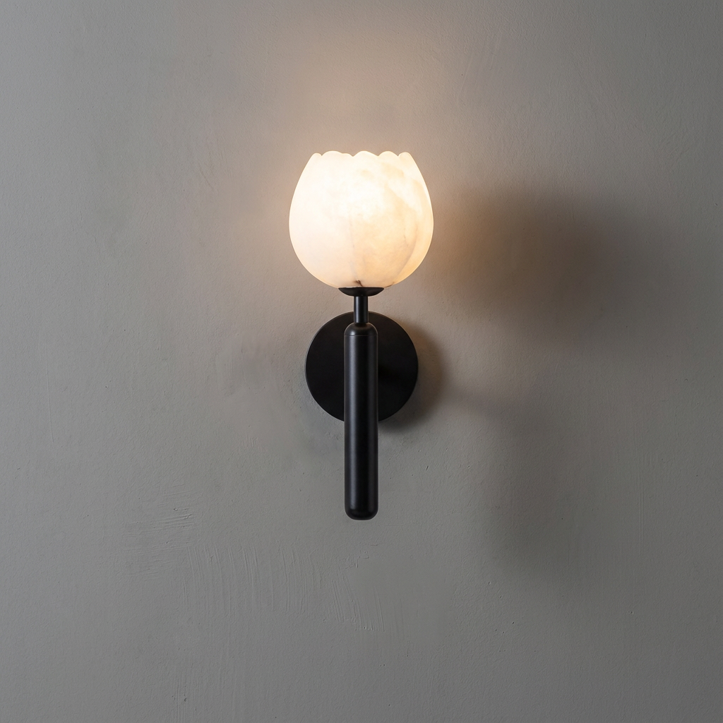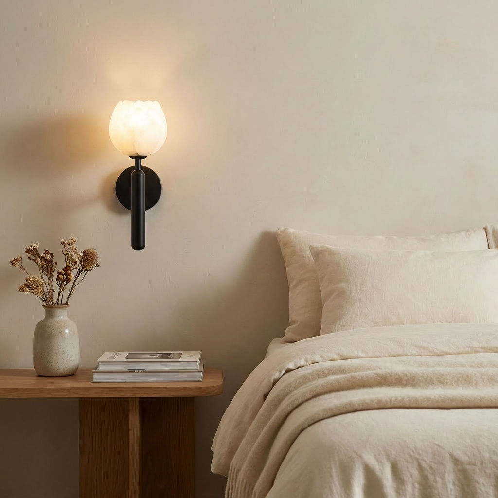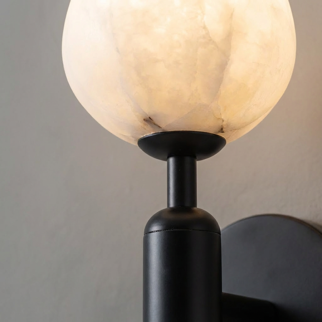 Designed with a simple alabaster globe mounted close to the wall, this wall sconce casts a soft, diffused glow that is ideal for bedroom use. The natural stone finish of the alabaster brings a subtle warmth and refined texture to any space, enhancing the atmosphere without drawing undue attention. Its compact projection keeps the fixture unobtrusive beside the bed or along narrow passages, providing comfortable illumination where space is limited. It performs beautifully as a pair flanking headboards, mirrors, or architectural features, adding a gentle layer of light that complements the room rather than competing with it. Equally at home in hallways, bedrooms, and living rooms, this sconce delivers a calm, ambient wall glow that adds depth and dimension without visual noise, contributing to a serene, modern interior.
