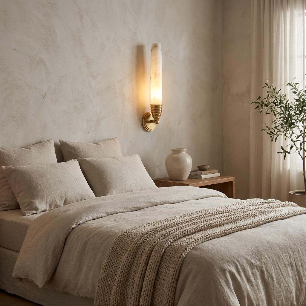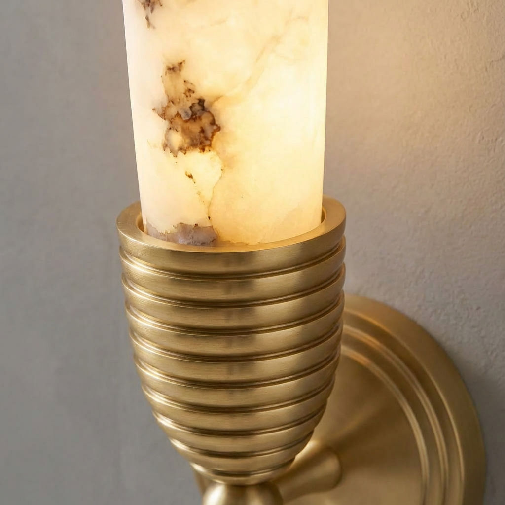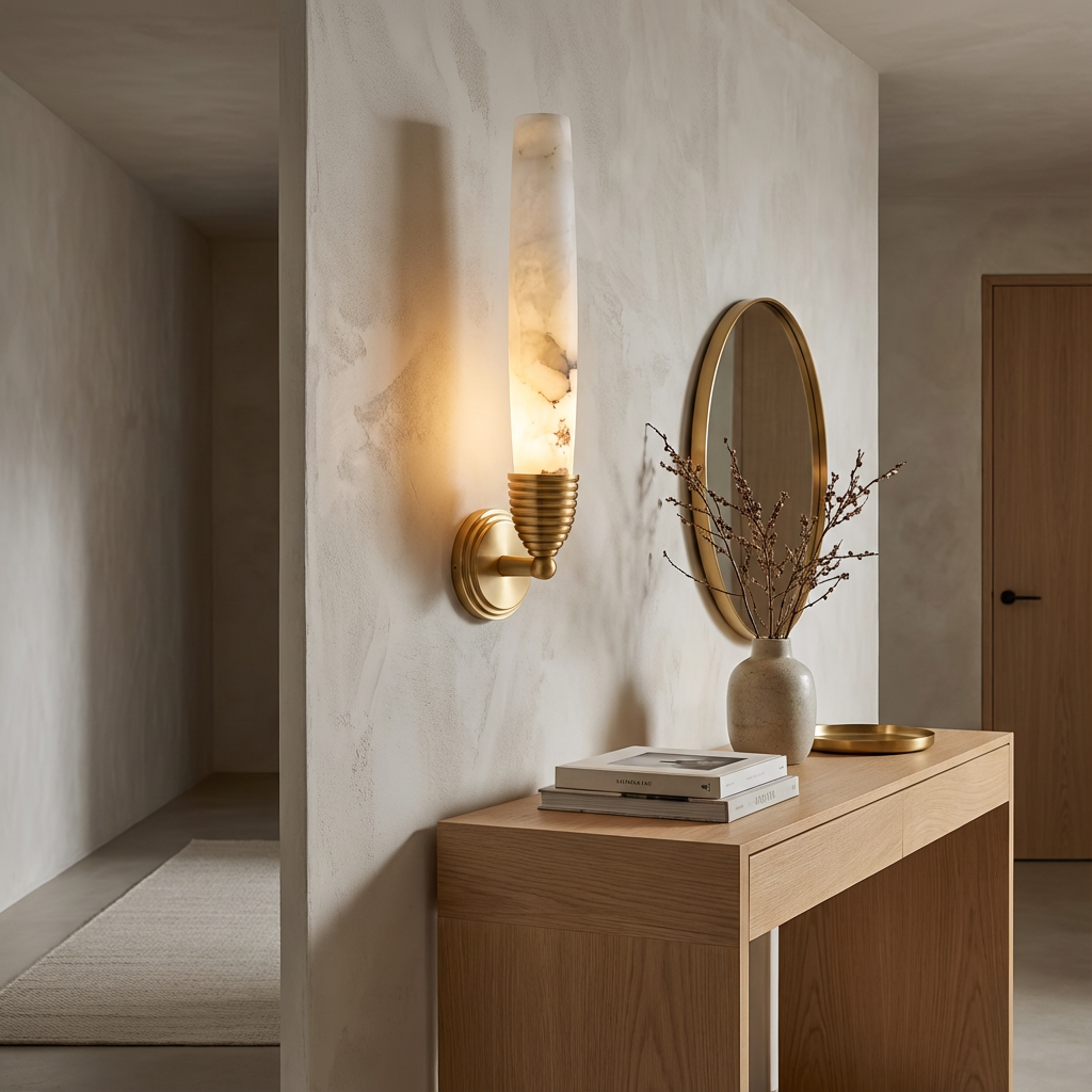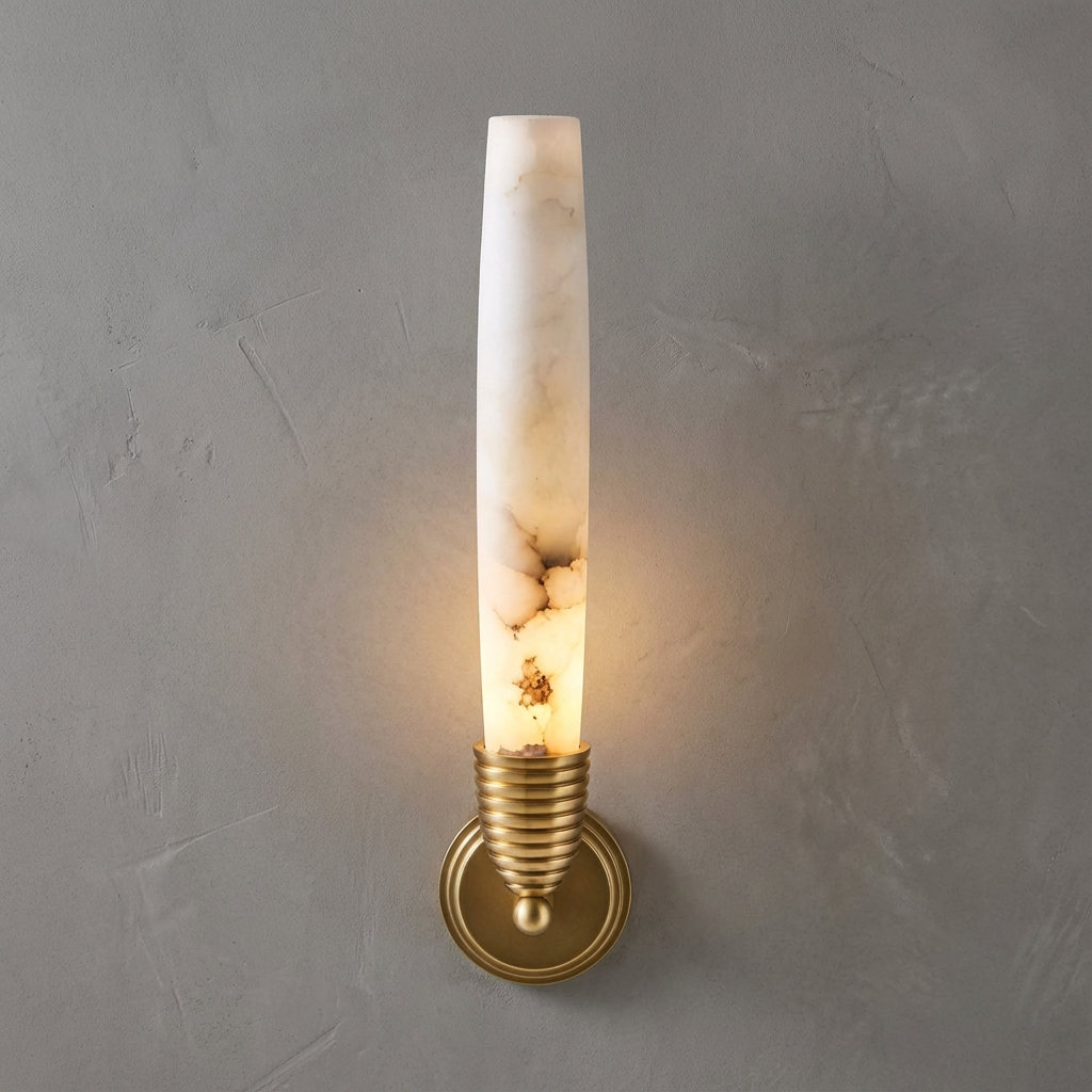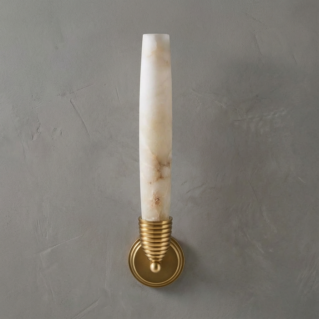 A refined wall sconce that pairs a carved alabaster element with integrated LED illumination for efficient, low-maintenance performance. The alabaster surface introduces natural depth and character, creating a softly luminous presence that enhances rather than overpowers the surrounding architecture. With its slim profile and clean lines, this sconce is ideal for hallways, stairwells, and modern living spaces that benefit from a subtle, even wall wash. It performs beautifully in bedrooms and living rooms as well, where a gentle wall glow adds visual depth and ambiance without unwanted visual noise.