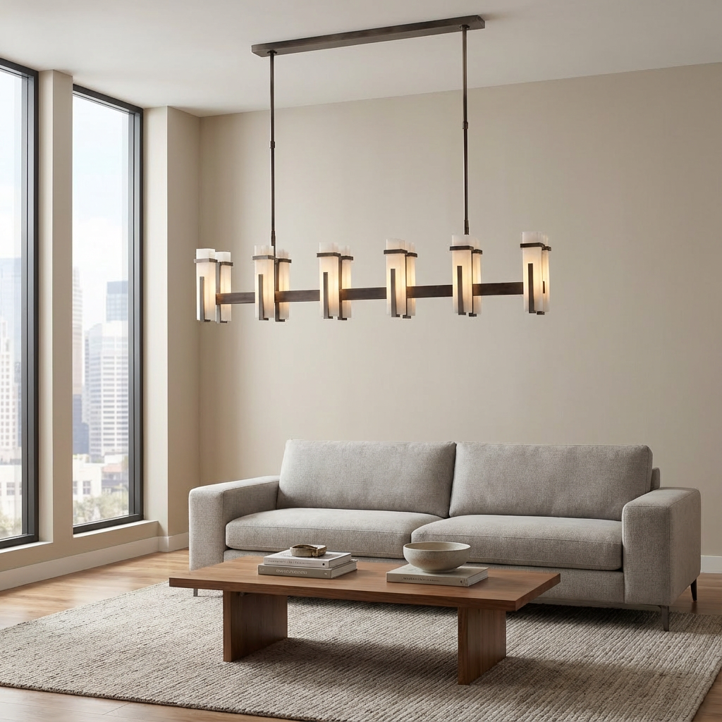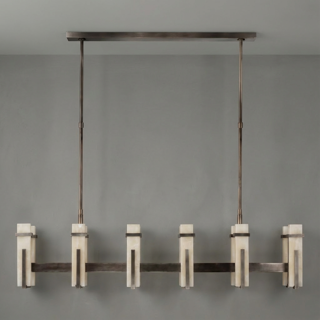 This large linear chandelier draws inspiration from tailored decorative lighting, pairing luminous alabaster components with a structured, elongated frame. The refined composition creates a sophisticated focal point while distributing light evenly along its length, making it especially well suited to long dining tables and kitchen islands. With its precise proportions and restrained aesthetic, this chandelier complements both traditional and contemporary furnishings. Its elongated form is ideal for open-plan kitchens and dining spaces where a single, balanced gesture of light is desired, while the compact canopy keeps the ceiling line clean and understated for a polished, modern finish.