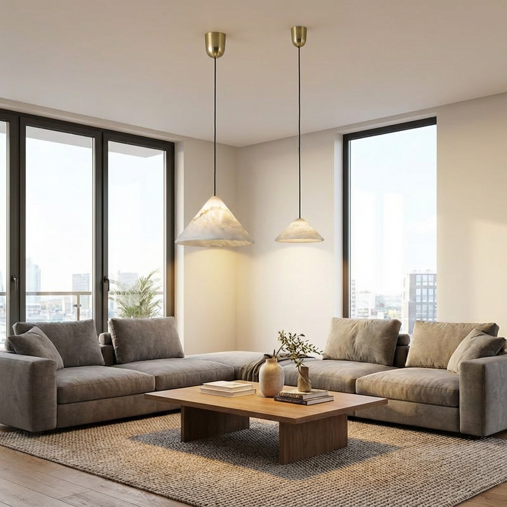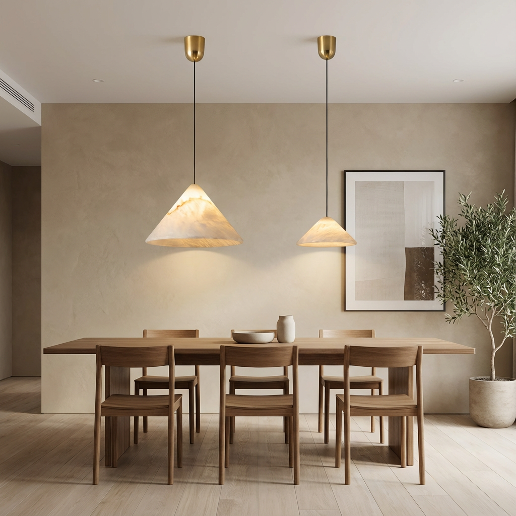 Designed specifically for kitchen islands, this pendant light pairs a linear alabaster form with a carefully scaled suspension system. The natural stone surface adds subtle movement and warmth, while its modern, streamlined profile coordinates effortlessly with a variety of cabinetry and appliance finishes. Along the length of the counter, the fixture delivers consistent, diffused illumination that supports both everyday tasks and ambient lighting needs. Its elongated composition makes it especially suited to open-plan kitchens and dining spaces, where a single, balanced gesture of light can define the room. Refined mounting details allow the piece to appear light and effortless once installed, enhancing the sense of openness above the island while maintaining a strong, architectural presence.