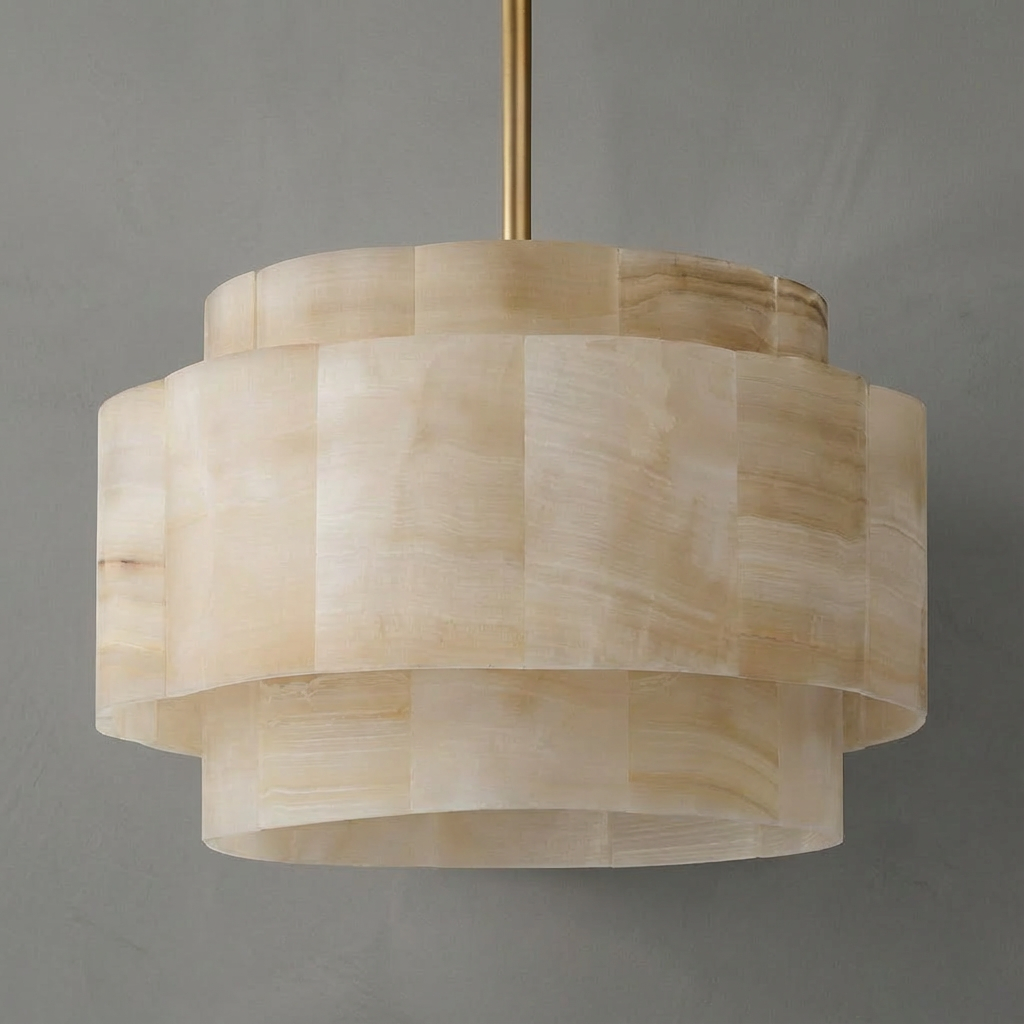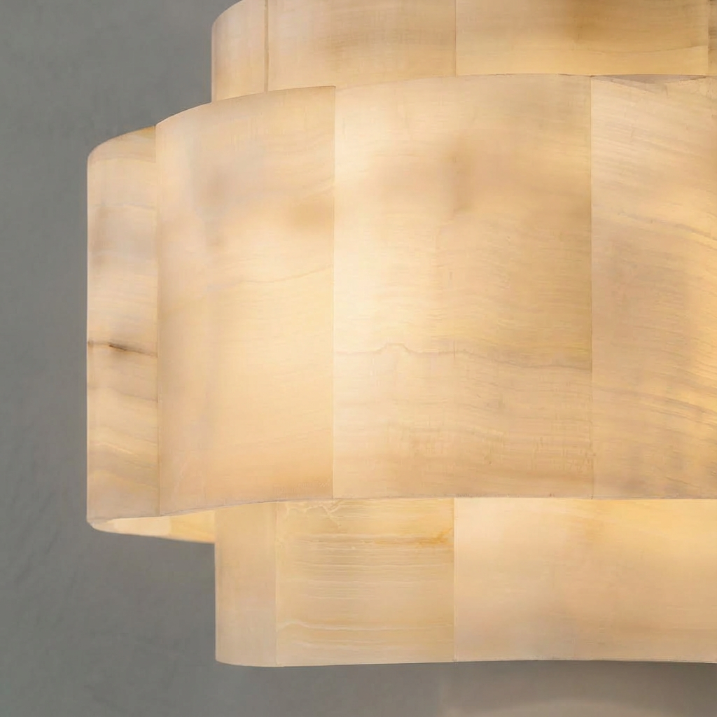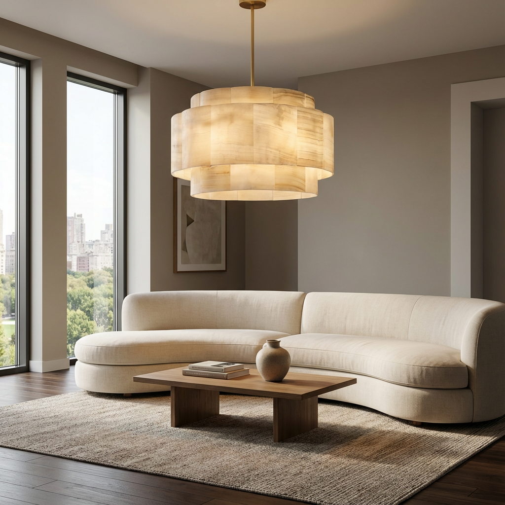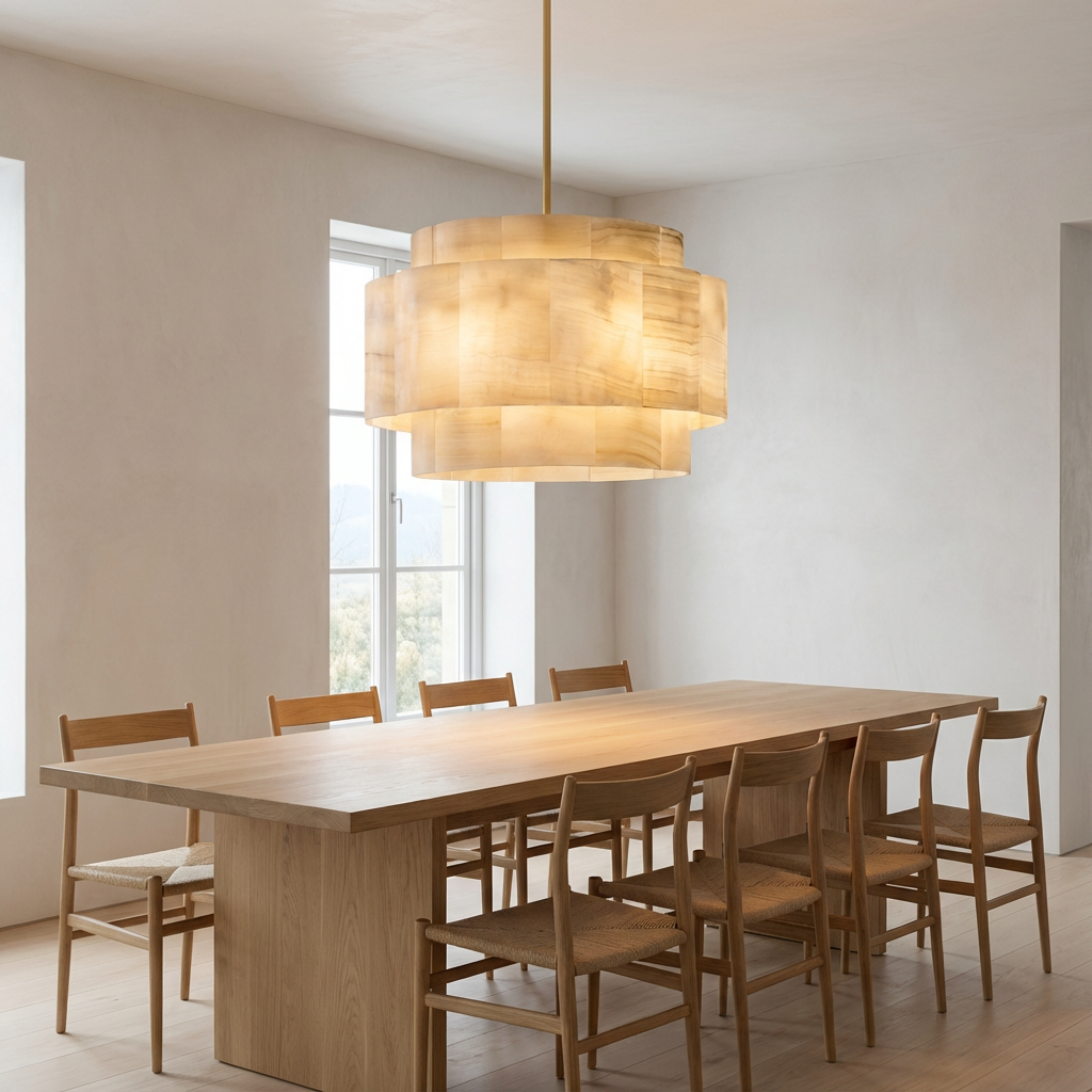 A generous alabaster pendant available in 22-inch and 27-inch diameters, this piece is designed for spaces that benefit from a substantial, single-fixture statement. The broad circular shade in natural alabaster emits a soft, enveloping light that is especially suited to dining tables and living areas, bringing a warm, inviting glow to the room. Its simple outline and natural stone finish lend a refined presence that works seamlessly in both contemporary and transitional interiors. Used alone, it becomes a quiet focal point; grouped in staggered heights, it creates a layered, architectural composition ideal for entries, stairwells, or reading corners that call for a sophisticated accent. Thoughtfully considered mounting details keep the overall impression light and effortless once installed, allowing the alabaster to remain the star while the fixture itself feels airy and understated.