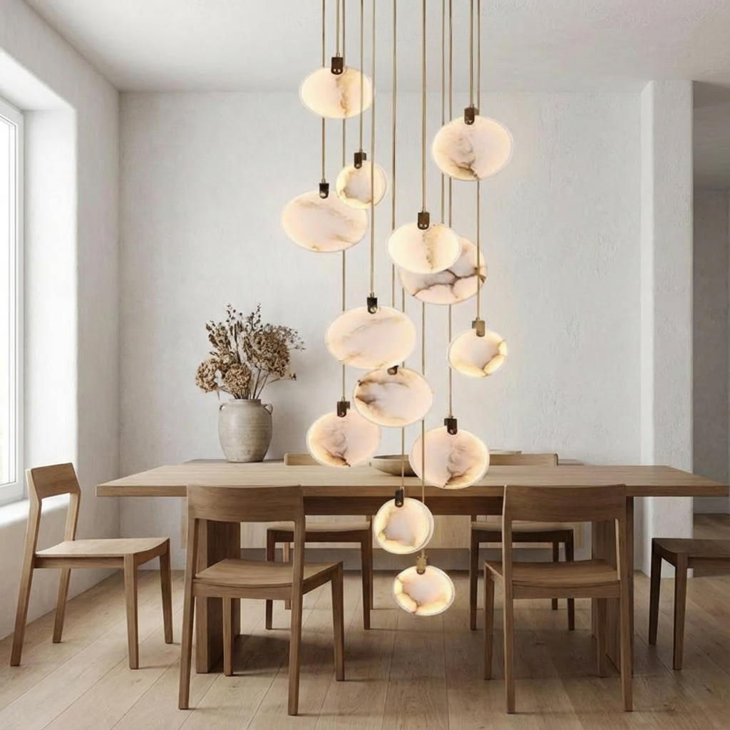 The multiple style variations allow you to tailor the arrangement to your ceiling height and layout, ensuring a balanced presence whether suspended low over a table or higher in an open void. A compact canopy keeps the ceiling line clean and understated, allowing the alabaster forms and the play of light to take center stage. The result is a composed, modern chandelier that quietly ties the room together while enhancing the sense of space.