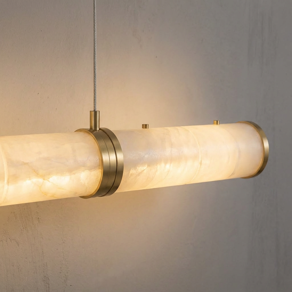 The Alabaster Modern Art Linear Chandelier boasts a sleek linear design, elevated by its alabaster shade, creating a standout fixture. Crafted from premium Spanish alabaster, the shade not only ensures a captivating light effect but also imparts a warm and natural ambiance.