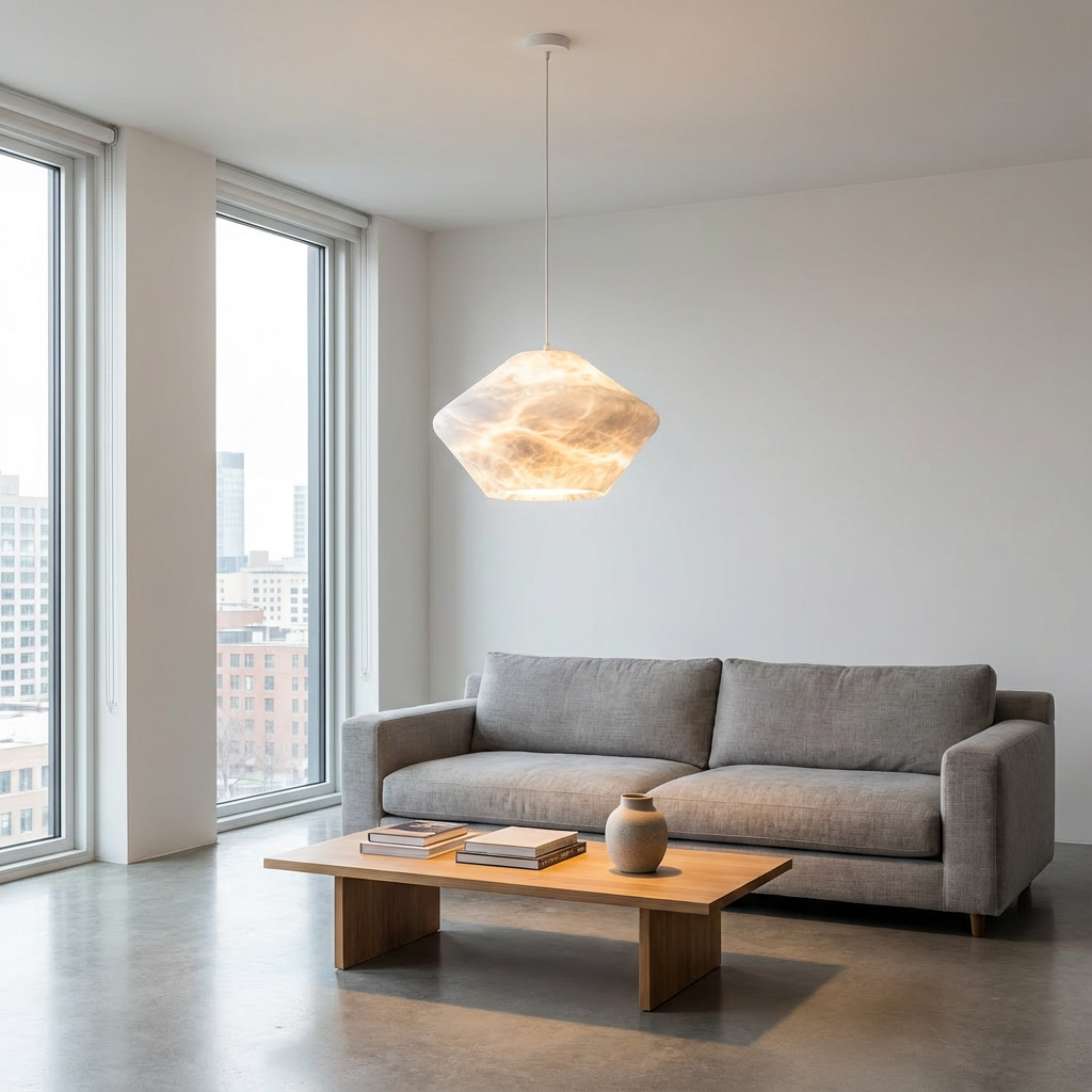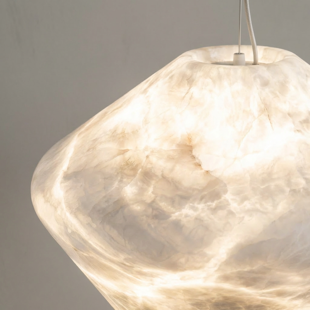 Carved from a single mass of natural alabaster, this pendant takes on a faceted, comet-like form-softly geometric, yet organic in presence. When illuminated, the stone reveals layered veining and clouded depth, creating a warm, flowing glow that feels calm and atmospheric rather than bright or sharp. The sculptural silhouette hangs lightly from a slim cord, allowing the alabaster to remain the focal point. Ideal above a dining table, in a living room, or as a quiet statement in minimalist interiors, it brings warmth, texture, and subtle movement to contemporary spaces. - Materials: solid natural alabaster shade - Finish: natural stone with matte surface - Light effect: soft, diffused ambient glow - Note: alabaster is naturally varied; veining, translucency, and tone will differ slightly from piece to piece