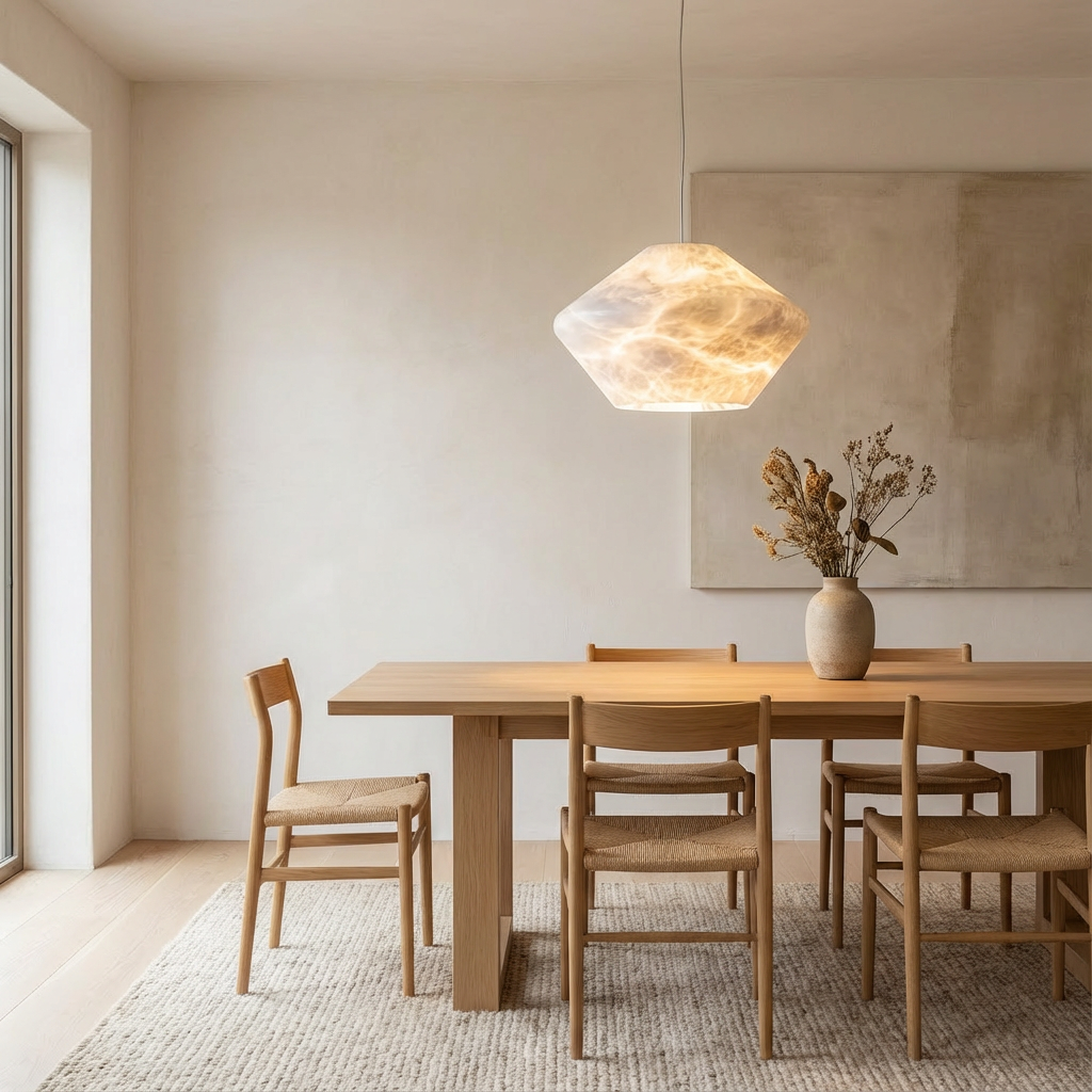 Carved from a single mass of natural alabaster, this pendant takes on a faceted, comet-like form—softly geometric, yet organic in presence. When illuminated, the stone reveals layered veining and clouded depth, creating a warm, flowing glow that feels calm and atmospheric rather than bright or sharp.