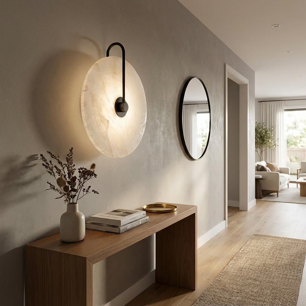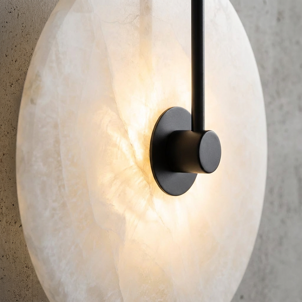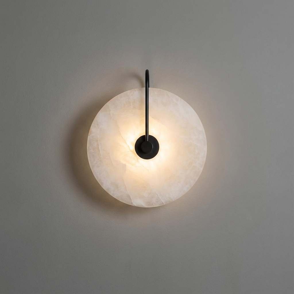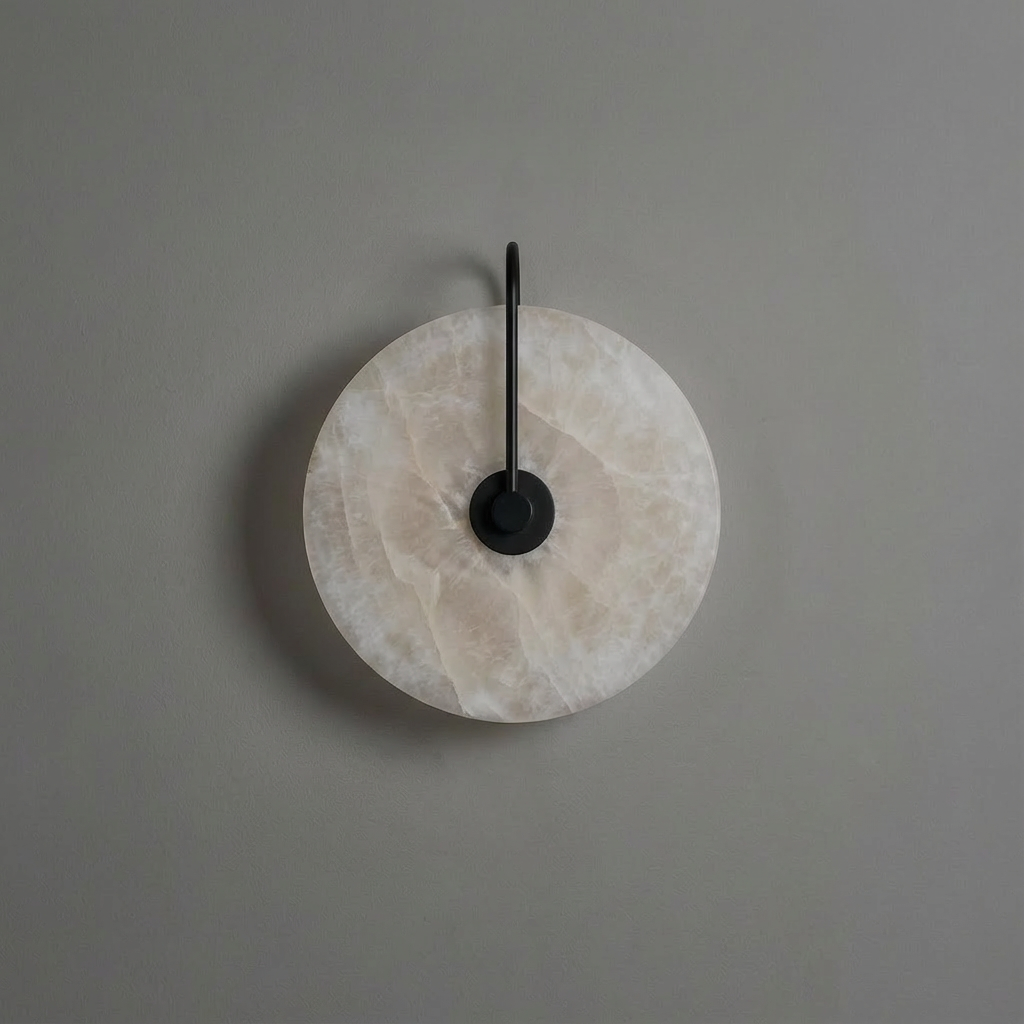 This wall sconce features a refined circular slab of natural alabaster, balanced by a slim black metal arm that intersects the form with quiet precision. Inspired by the purity of a record-like disc, the design feels both architectural and soft, allowing material and proportion to speak without ornament. When illuminated, the alabaster diffuses light gently across its surface, revealing natural veining and subtle tonal shifts unique to each piece. The glow radiates outward with a calm, ambient warmth, while the central metal element provides visual contrast and structural clarity. The composition is minimal yet expressive, making the sconce well suited for bedrooms, hallways, living areas, or reading corners where soft, indirect light is desired. It pairs naturally with modern, minimalist, and warm contemporary interiors, especially those that emphasize texture, neutral palettes, and thoughtful craftsmanship. Each piece is crafted from genuine alabaster, ensuring no two fixtures are exactly alike. Variations in veining, translucency, and pattern are inherent to the stone and celebrated as part of its character.