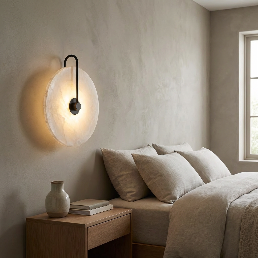 When illuminated, the alabaster diffuses light gently across its surface, revealing natural veining and subtle tonal shifts unique to each piece. The glow radiates outward with a calm, ambient warmth, while the central metal element provides visual contrast and structural clarity. The composition is minimal yet expressive, making the sconce well suited for bedrooms, hallways, living areas, or reading corners where soft, indirect light is desired. It pairs naturally with modern, minimalist, and warm contemporary interiors, especially those that emphasize texture, neutral palettes, and thoughtful craftsmanship. Each piece is crafted from genuine alabaster, ensuring no two fixtures are exactly alike. Variations in veining, translucency, and pattern are inherent to the stone and celebrated as part of its character.