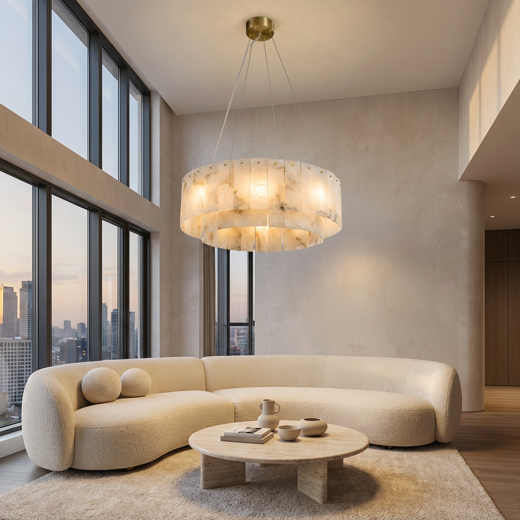 This round chandelier is formed from a continuous ring of hand-cut alabaster panels, arranged in a layered composition that feels both balanced and sculptural. Each stone segment is softly illuminated from within, allowing natural veining and mineral variations to unfold gradually across the surface. Suspended by fine cables from a warm brass canopy, the circular form appears light and floating despite its substantial presence. The rhythm of vertical alabaster pieces introduces depth and texture, while the round silhouette brings harmony and calm to the space. When lit, the chandelier emits a warm, ambient glow that spreads evenly in all directions, creating an inviting atmosphere without glare. It works beautifully above dining tables, in living rooms, or in open-plan spaces where a centered, architectural focal point is desired. Crafted from genuine alabaster, every chandelier is unique. Variations in tone, translucency, and veining are natural characteristics of the stone and are embraced as part of its refined, timeless character.
