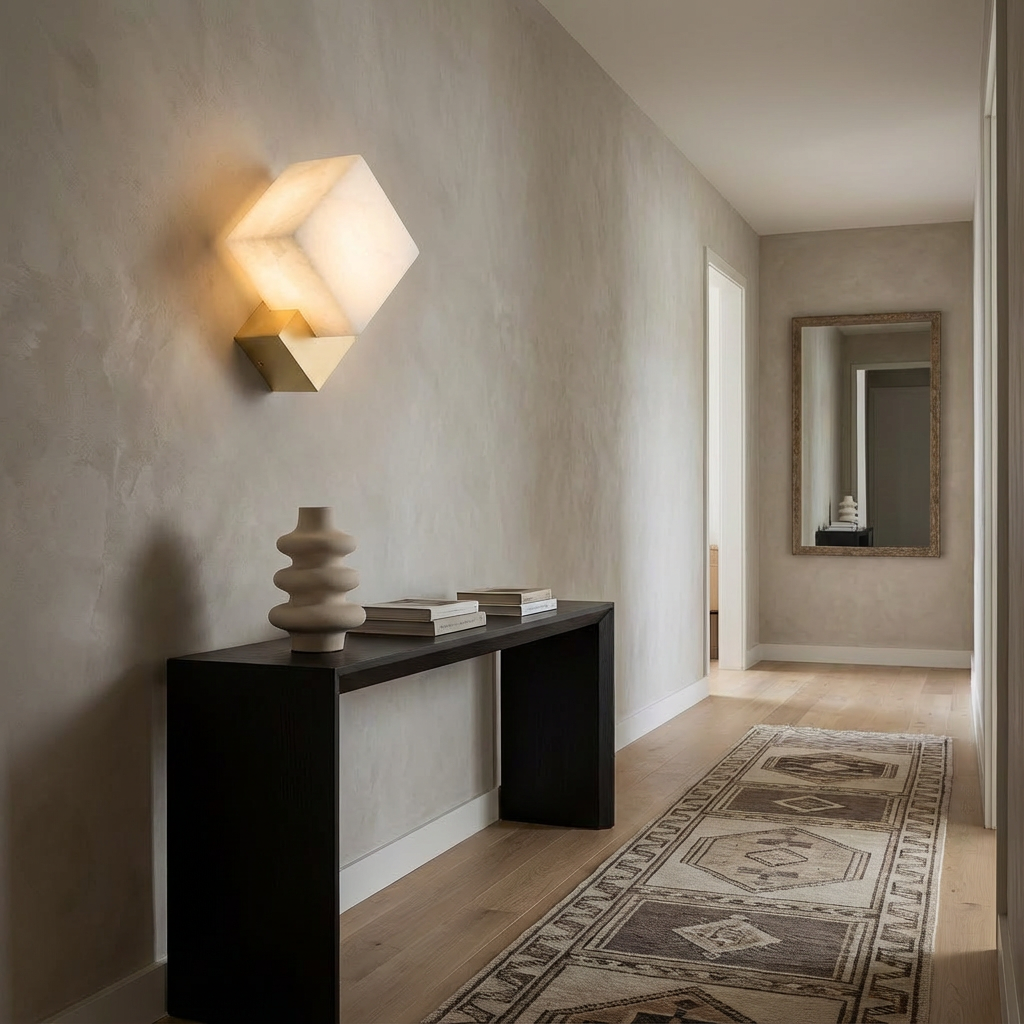 This wall sconce features a sculptural cube of natural alabaster, rotated into a diamond-like orientation and anchored by a solid brass base. The geometric form feels precise yet warm, allowing clean lines and natural material to coexist in quiet balance. When illuminated, the alabaster softly diffuses light through its faceted surfaces, revealing subtle veining and mineral depth unique to each piece.
