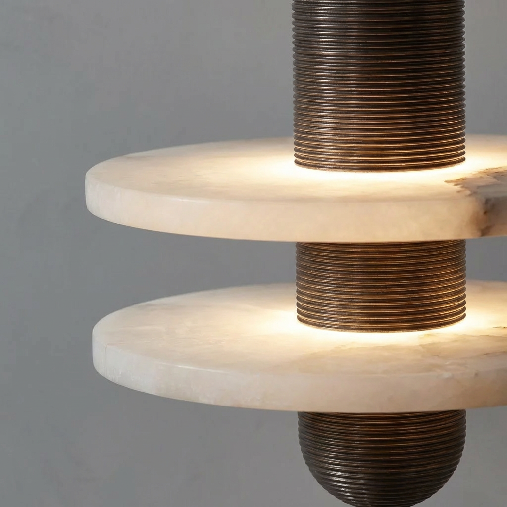 This pendant design features a sculptural composition of stacked alabaster discs suspended around a finely detailed metal core. The contrast between the smooth, luminous stone and the textured metal column creates a refined balance of softness and structure. When illuminated, light passes gently through the alabaster rings, producing a warm, layered glow that feels calm and atmospheric. The spacing between each disc adds depth and visual rhythm, allowing the light to breathe rather than appear flat or harsh.