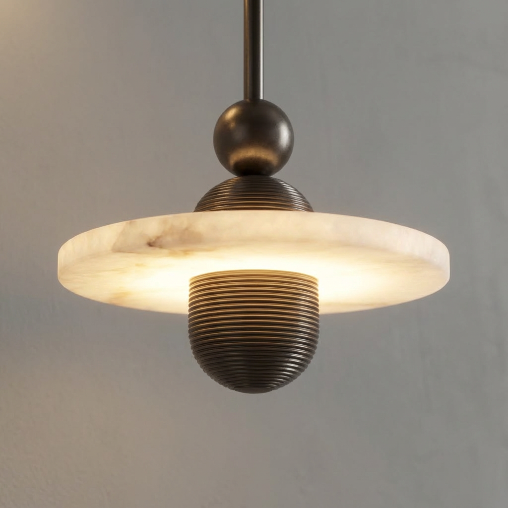 This pendant design brings together sculptural alabaster and finely detailed metal in a composition that feels calm, balanced, and quietly expressive. A ribbed metal core is intersected by a circular alabaster disc, creating a strong horizontal line that contrasts with the vertical body and suspension. When illuminated, light passes softly through the alabaster ring, revealing natural veining and a warm, cloud-like translucency. The metal elements remain crisp and tactile, grounding the design while allowing the stone to remain the visual focus. The result is a gentle, atmospheric glow rather than direct brightness.