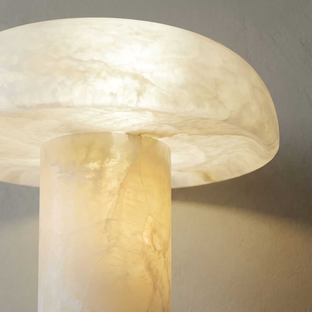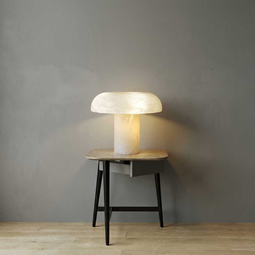 Shaped with a tender, organic curve, this table lamp resembles a small sculpted mushroom rendered entirely in alabaster. When illuminated, the alabaster cap glows with a soft, buttery diffusion while the stem remains cool and opaque, creating a subtle play of light and shadow. Its warm, grounded presence brings comfort to nightstands and reading nooks, inviting a calm, intimate atmosphere. The scale and character make it a natural fit for desks, bedside pairings, or living room consoles that benefit from a refined, softly glowing focal point.
