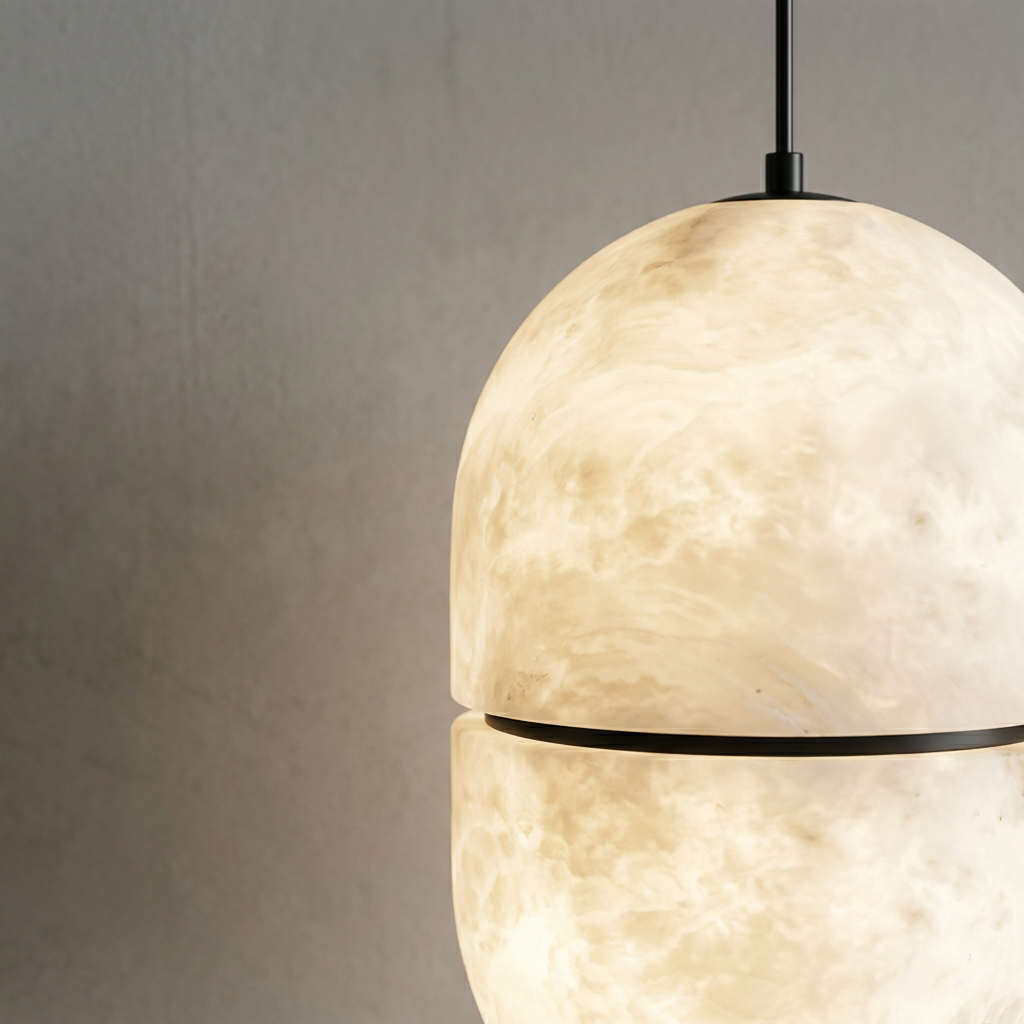 Each alabaster piece reveals its own subtle mineral markings, ensuring every fixture has a distinct, understated character. Whether hung at staggered heights as a grouped installation or suspended on its own, it adapts effortlessly to entries, stairwells, or reading corners that call for a refined accent. The ceiling hardware is kept deliberately minimal, allowing the eye to rest on the illuminated alabaster form and its gentle, sculptural presence.