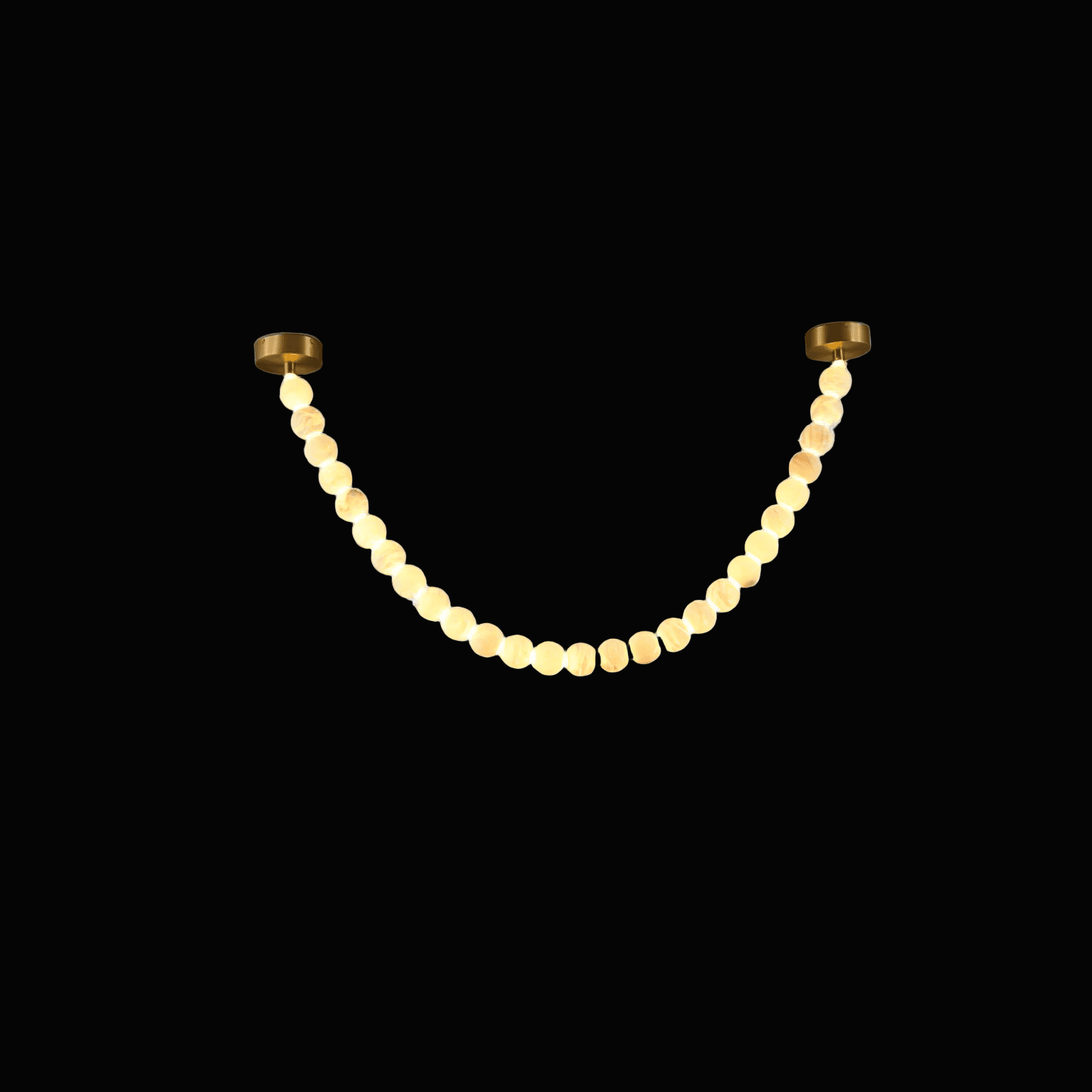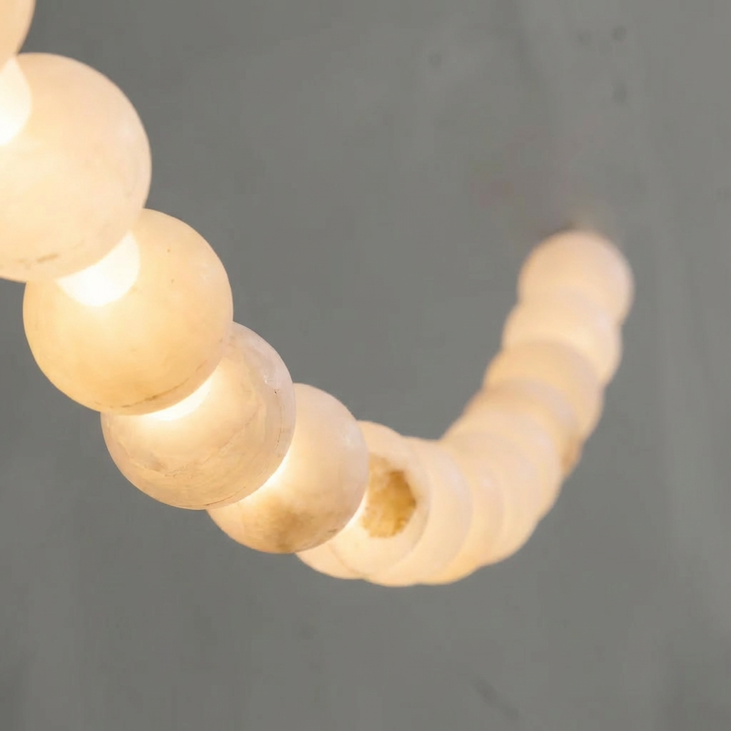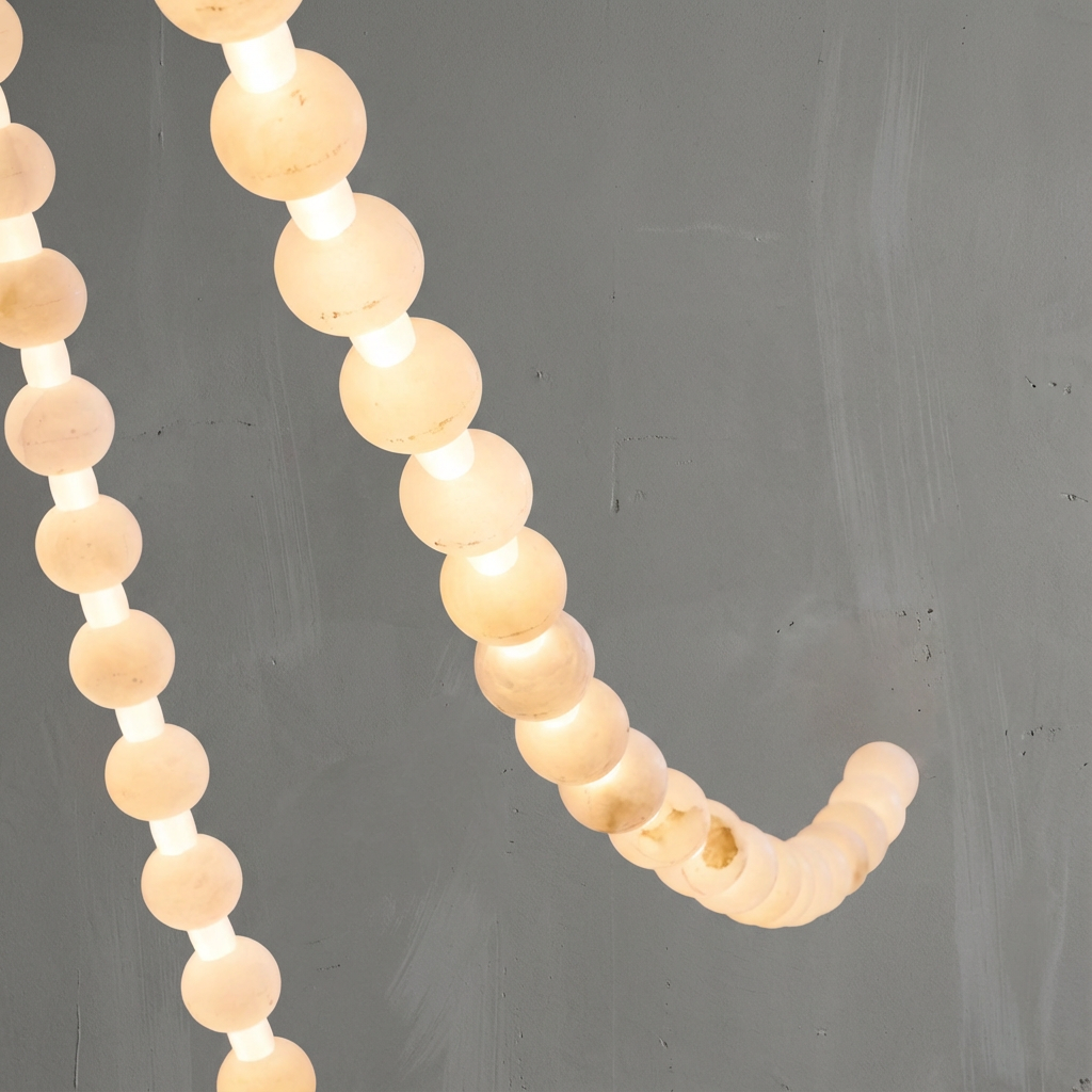 A strand of alabaster globes drapes like an elegant necklace, each orb glowing with a calm, even radiance. Subtle shifts of tone within the alabaster lend depth and character, creating a refined yet playful composition that feels artful from every angle. Designed as a central chandelier for living or dining rooms, it offers a warm focal point that feels intentional yet understated. Its presence brings a soft theatricality to dining spaces or lounges, inviting conversation while never overwhelming the room. The ceiling hardware is kept deliberately minimal, allowing the eye to rest on the illuminated alabaster forms. The result is a quietly luxurious statement piece that elevates contemporary and classic interiors alike.