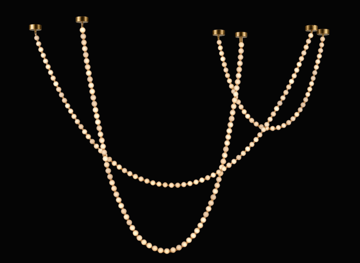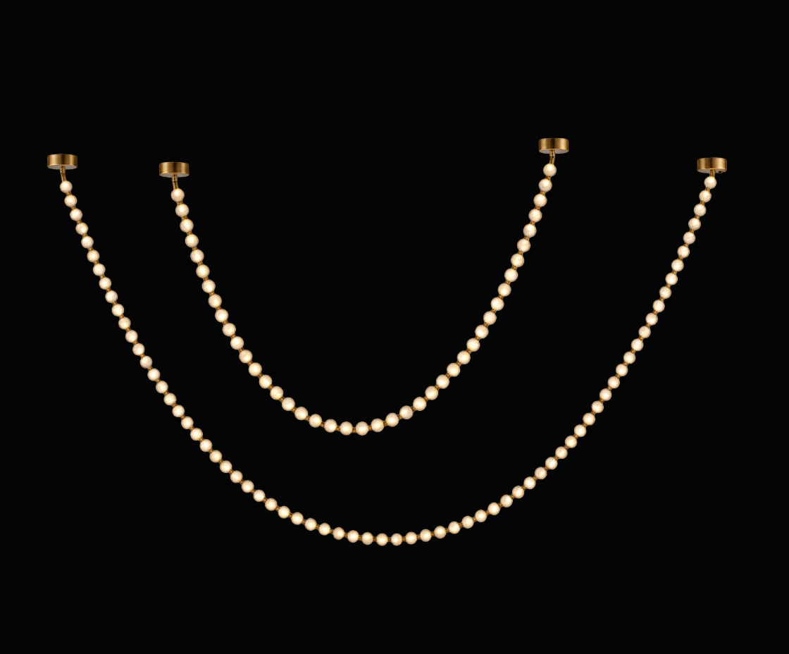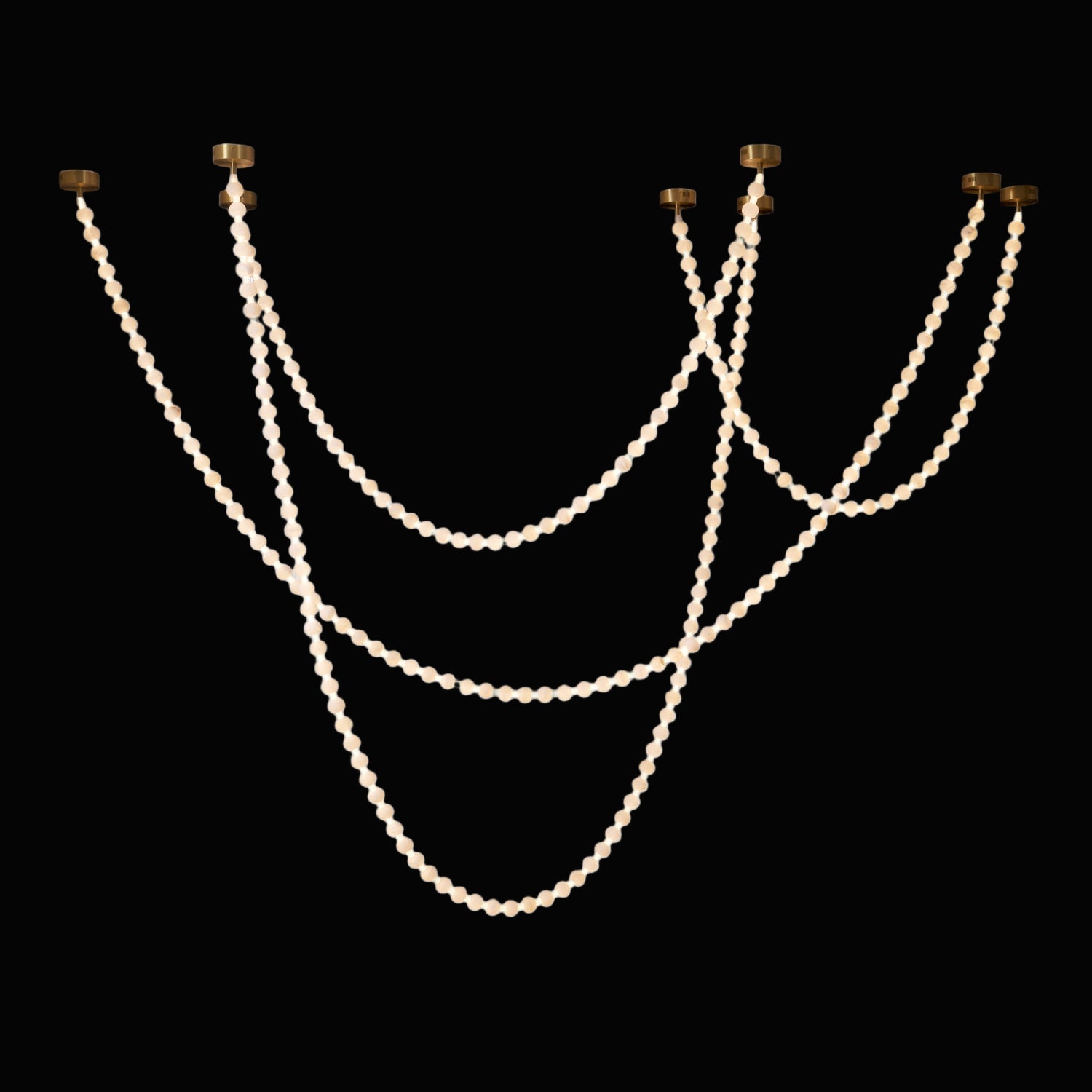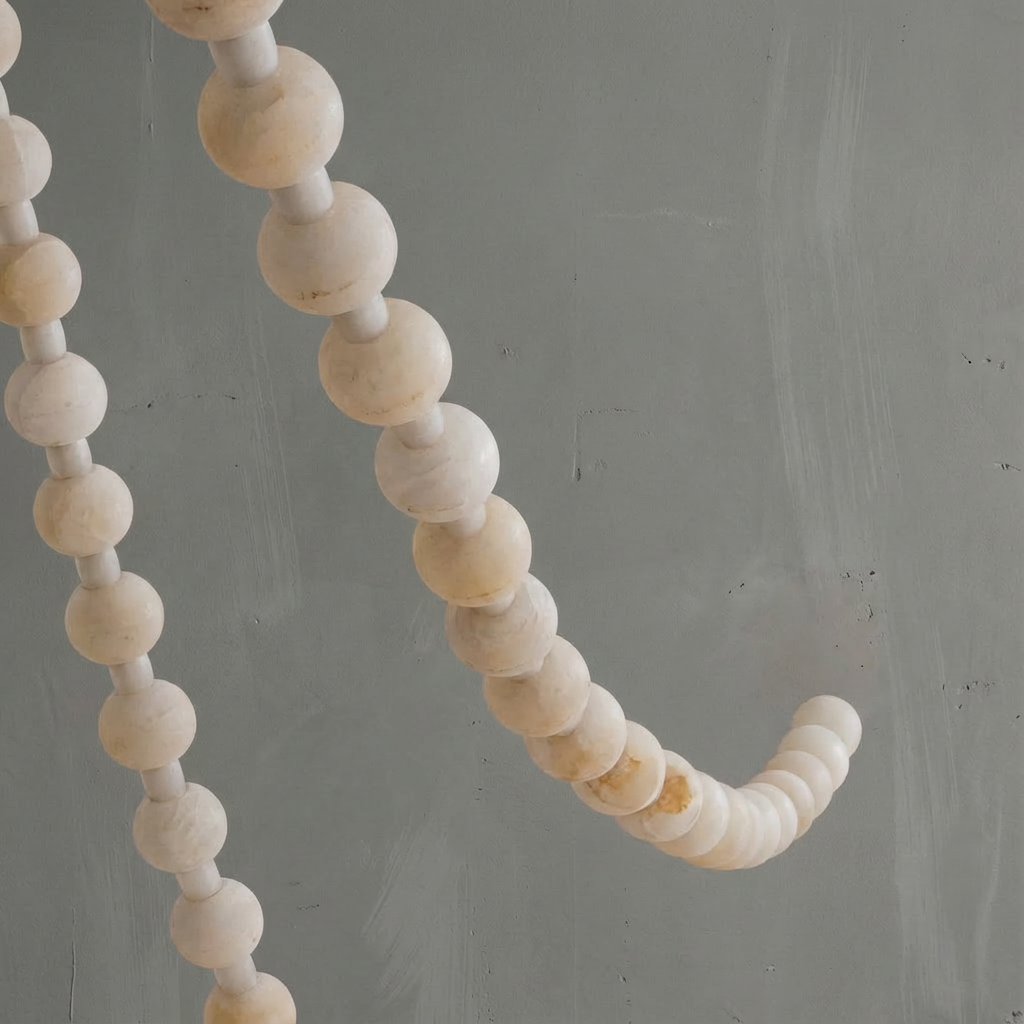 A strand of alabaster globes drapes like an elegant necklace, each orb glowing with a calm, even radiance. Subtle shifts of tone within the alabaster lend depth and character, creating a refined yet playful composition that feels artful from every angle. Designed as a central chandelier for living or dining rooms, it offers a warm focal point that feels intentional yet understated. Its presence brings a soft theatricality to dining spaces or lounges, inviting conversation while never overwhelming the room. The ceiling hardware is kept deliberately minimal, allowing the eye to rest on the illuminated alabaster forms. The result is a quietly luxurious statement piece that elevates contemporary and classic interiors alike.
