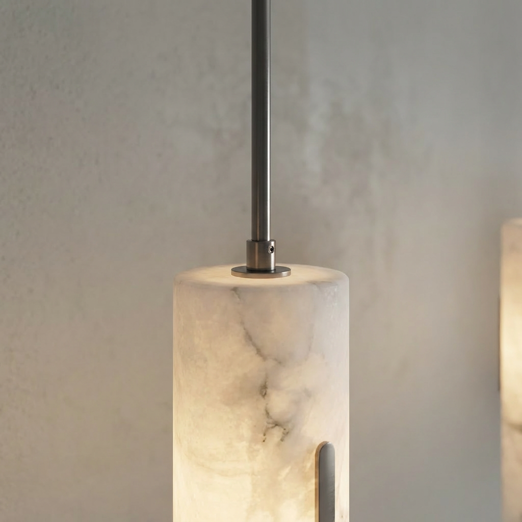 A pendant that pairs clean alabaster with a subtle decorative accent, this piece has a refined, tailored presence. The natural stone diffuser softens the illumination into a warm, intimate aura, bringing a quiet glow to any setting. Perfect for quiet corners, bedside lighting, or elegant transitional spaces, it delivers directed light without harsh glare. It also works beautifully above kitchen islands, breakfast nooks, or bedside tables, where its gentle yet focused light feels both functional and inviting. Thoughtfully refined mounting details allow the pendant to appear light and effortless once installed, enhancing the surrounding architecture rather than competing with it.