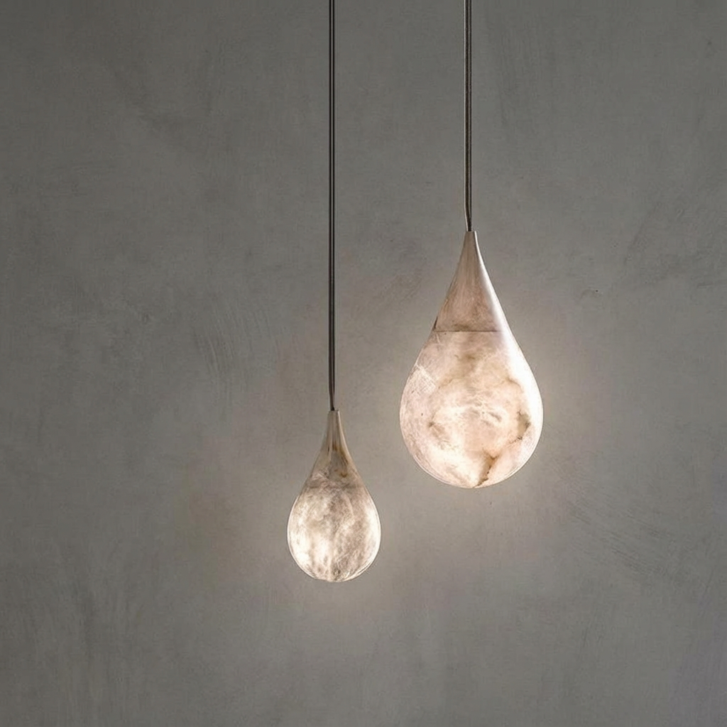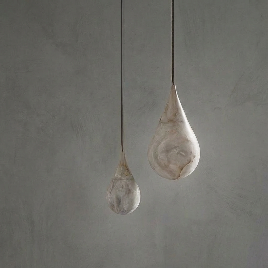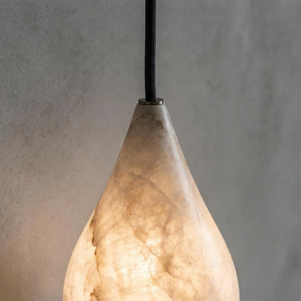 Sculpted in a soft raindrop silhouette, the Koltin Pendant Light celebrates the natural translucency of alabaster through a refined, organic form. Each shade is carved from solid alabaster, revealing delicate veining and subtle tonal variations that become gently illuminated when lit, creating a warm, atmospheric glow. Suspended from a slim cord, the tapered profile feels light and balanced, making it ideal for dining tables, kitchen islands, bedside arrangements, or intimate seating areas. Whether used as a single pendant or composed in a cluster at varied heights, Koltin introduces a quiet sense of movement and elegance to modern and minimalist interiors. Materials: