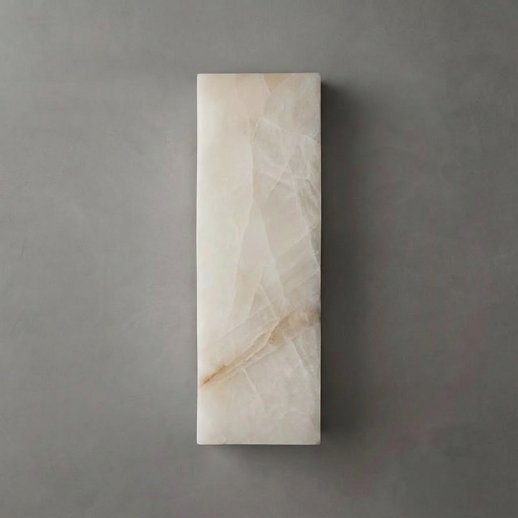 A tall alabaster sconce shaped with confident verticality, this piece brings sculptural presence to any wall. Its luminous alabaster surface glows in layered gradients, revealing shifting mineral tones and a refined, ambient wash of light. Strong enough to stand alone yet elegant enough to pair in symmetry, it adapts beautifully to a range of contemporary interiors. Used singly or in a rhythmic sequence along a corridor, it establishes a measured cadence of light that feels both modern and timeless.