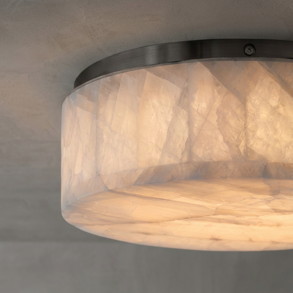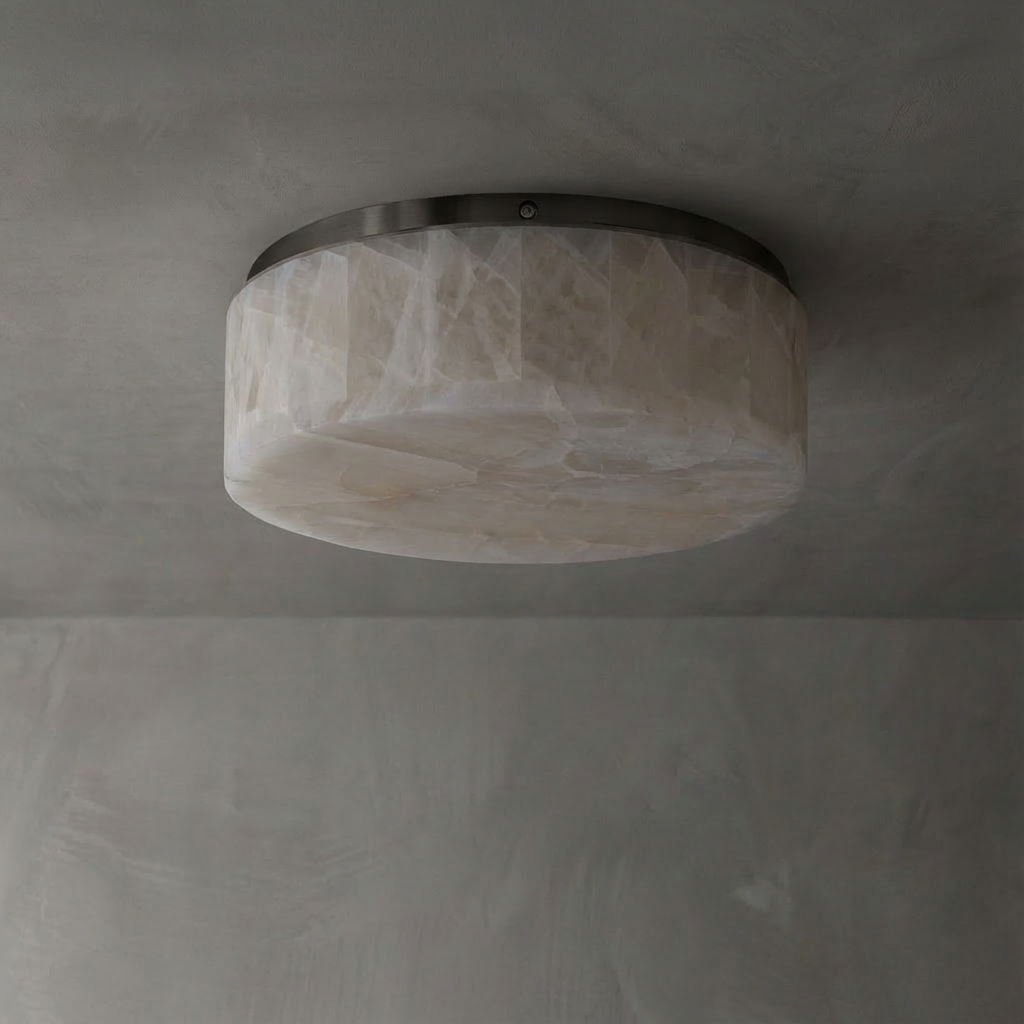This larger round flushmount casts a broad, even field of light, beautifully enhanced by alabaster's natural veining. When illuminated, the alabaster surface creates a soft horizon of warmth, bringing a serene, atmospheric glow to bedrooms and intimate gathering areas where overhead lighting should feel gentle and inviting. Its low, streamlined profile settles neatly into hallways, dressing areas, or compact rooms that benefit from a soft, well-distributed overhead glow. A compact canopy maintains a clean, understated ceiling line, allowing the alabaster to take center stage while complementing a refined, modern interior.