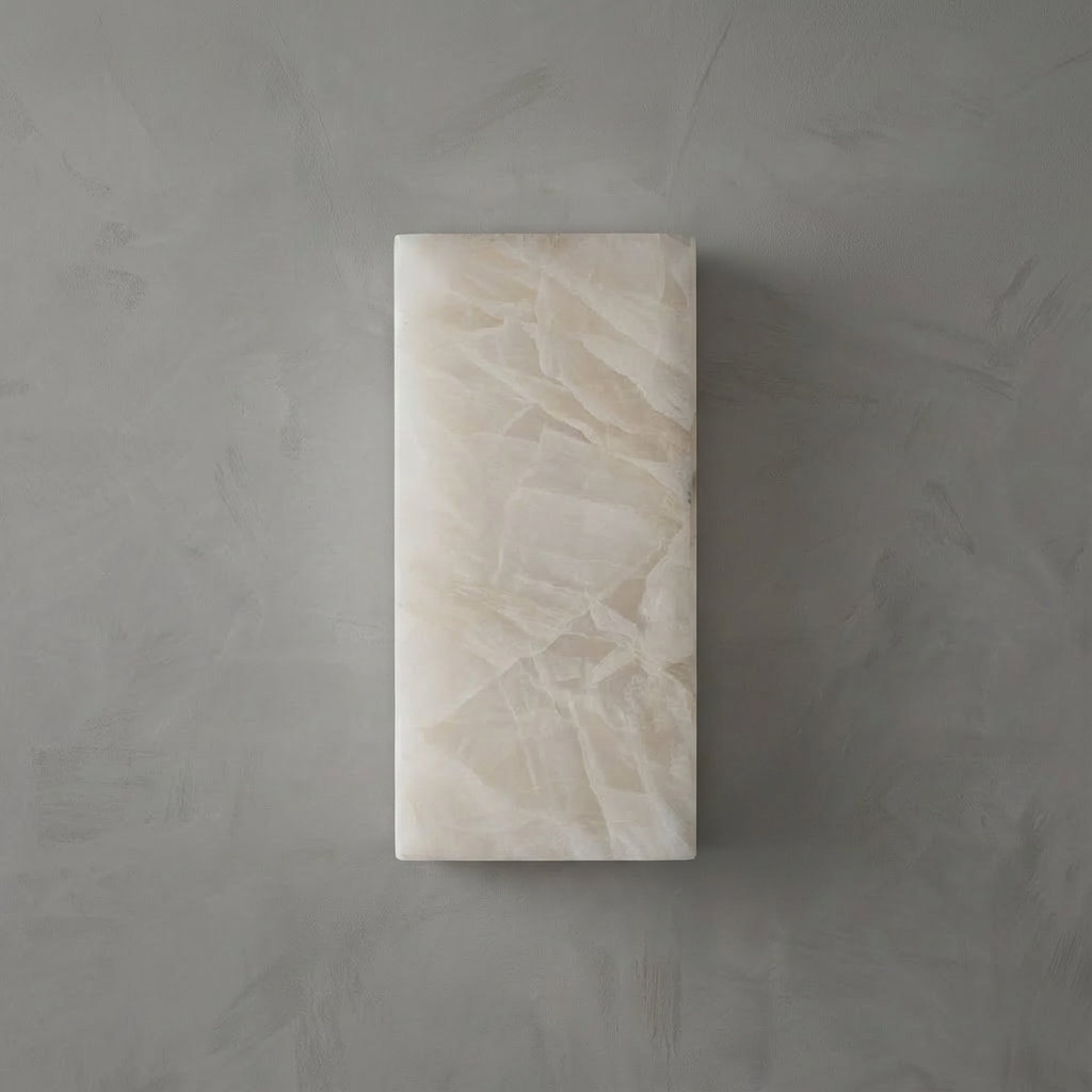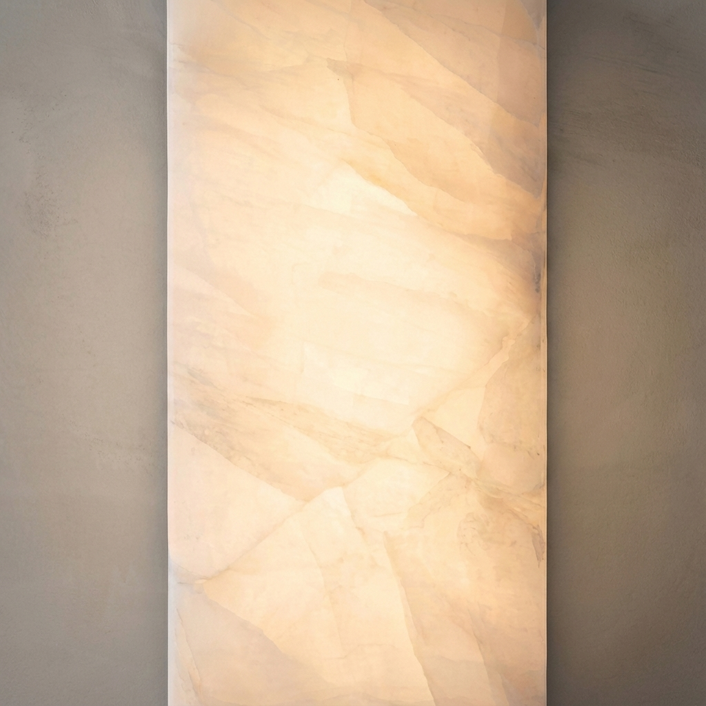 A vertical alabaster form defines this modern sconce, casting a warm ribbon of textured light along the wall. The natural stone's subtle clouding adds depth and nuance, creating a quietly luxurious presence even when the fixture is not illuminated. Mounted singly as a refined focal point or repeated in sequence along a corridor, it establishes a measured cadence of light that enhances contemporary interiors. The result is a sophisticated, understated accent that blends seamlessly into modern architectural spaces while bringing them gently to life.