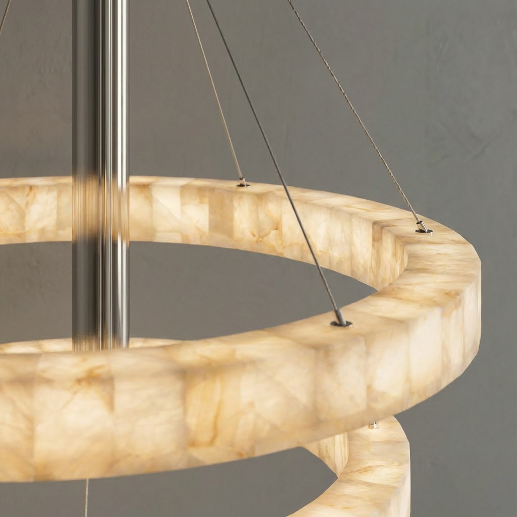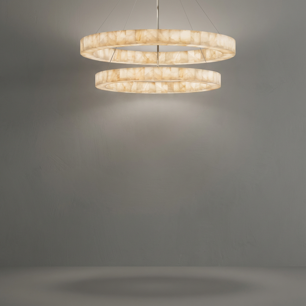 Two tiers of luminous alabaster circles form a striking round chandelier, perfectly balanced between softness and structure. The natural beauty of the alabaster creates a gentle, refined glow that feels warm and inviting. Designed to fill larger rooms with light, this chandelier brings poised, contemporary elegance to any space. Its layered silhouette and subtle diffusion make a sophisticated statement while maintaining an effortless, modern calm.