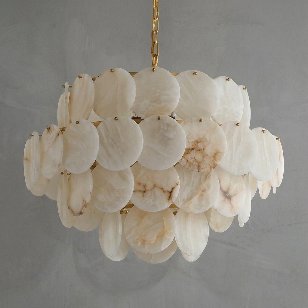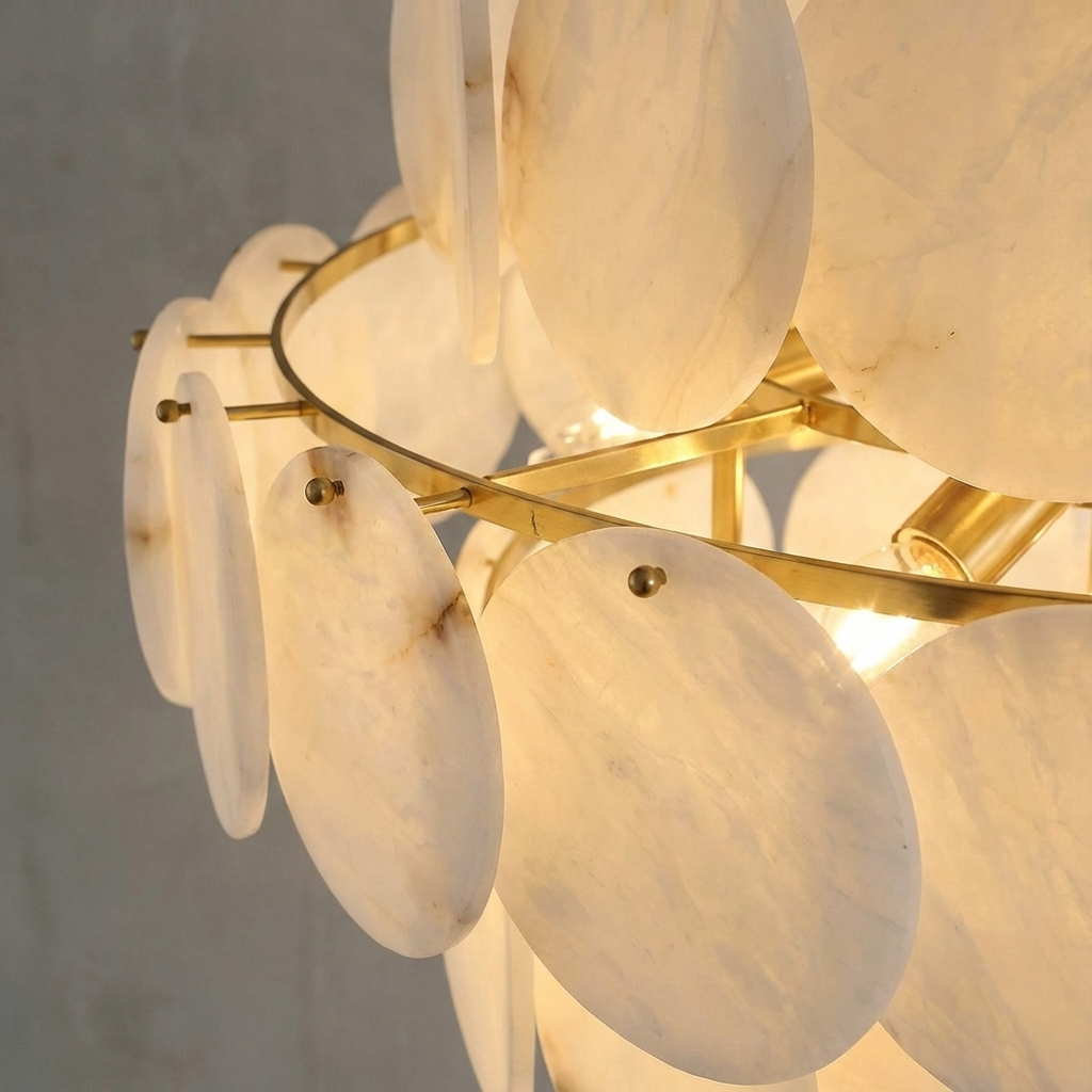 Shell‑inspired curves give this chandelier a softly organic presence, balancing sculptural form with understated elegance. Crafted with alabaster elements, it diffuses the light in gentle arcs, casting a warm, inviting glow across the room. The interplay of alabaster and brass adds depth and refinement, making it equally suited to intimate dining spaces or elevated living areas. Both luminous and artful, this chandelier becomes a focal point that feels timeless yet modern.